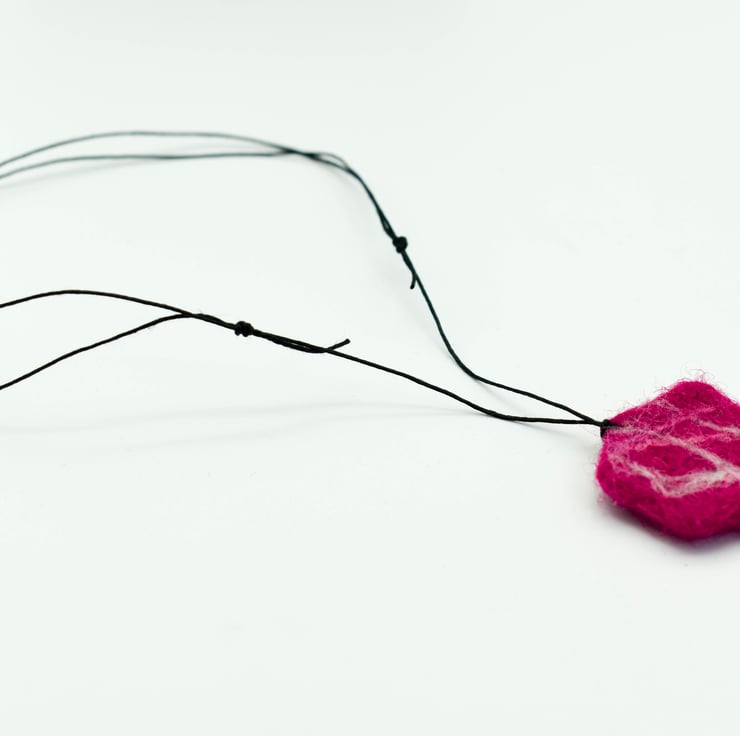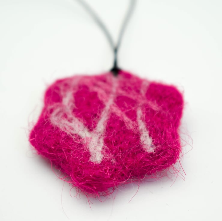 This statement necklace has been created using by needle felting pink and white wool into a marble effect star shaped pebble strung on black 0.5mm hemp cord.