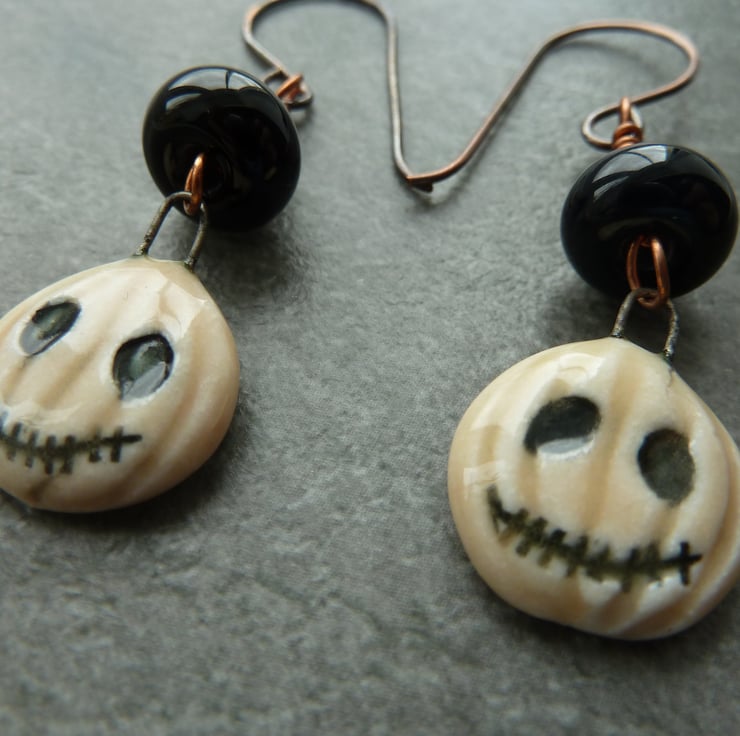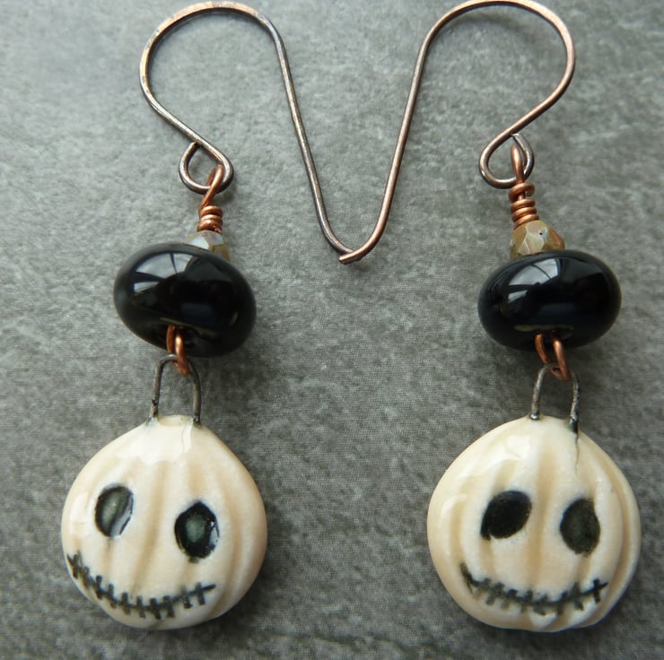 A pair of earrings made with handmade copper ear wires, handmade lampwork black glass beads and handmade ceramic pumpkin charms.