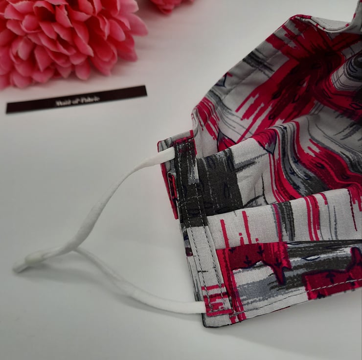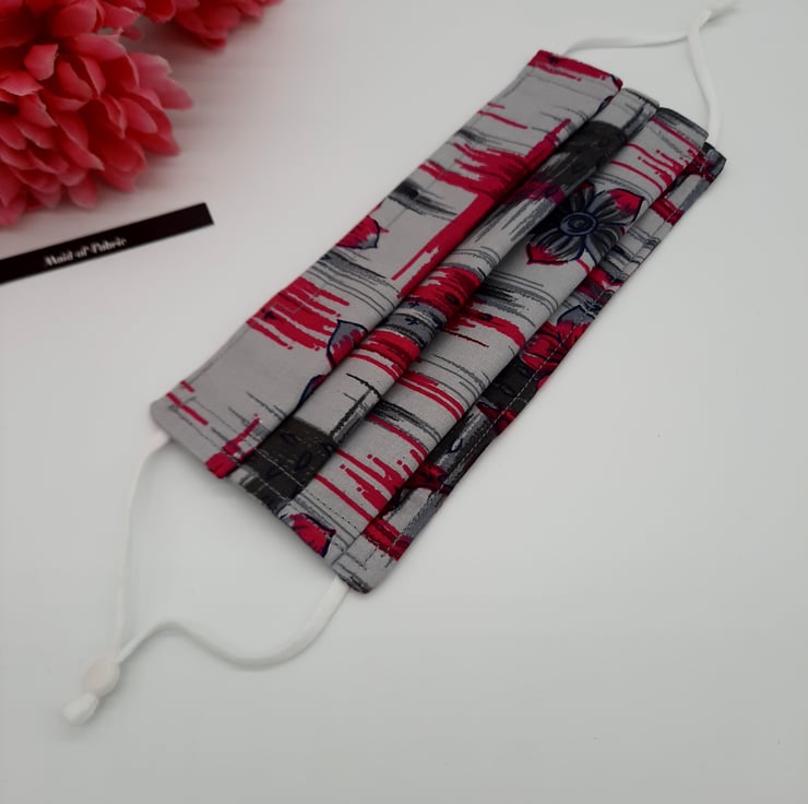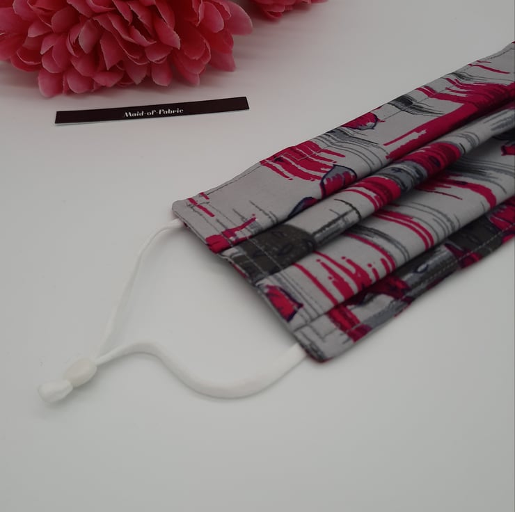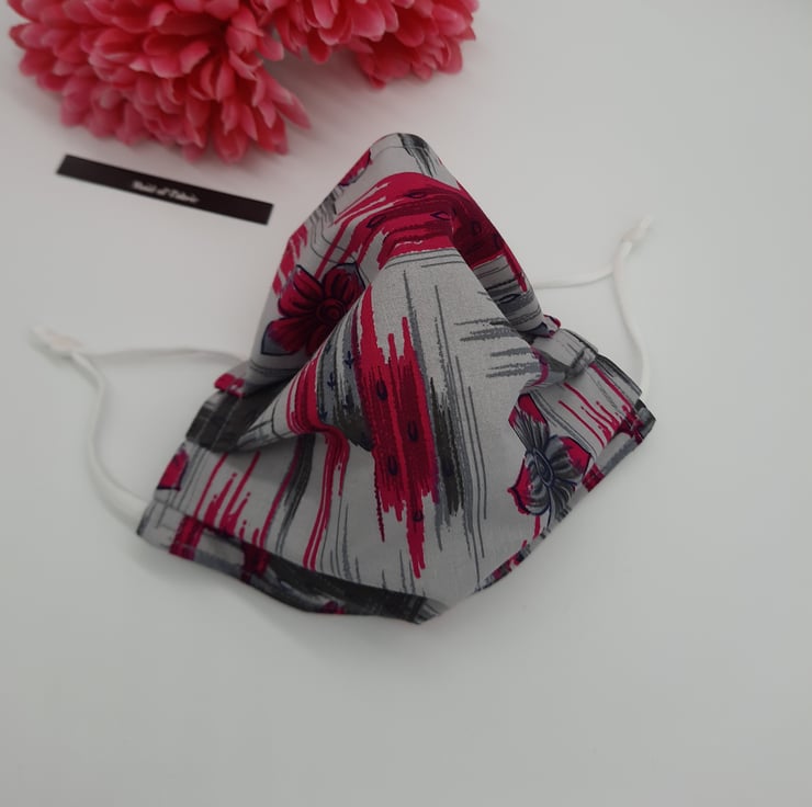 Face mask made using a pink and grey flower cotton fabric, adjustable soft white elastic and a 9cm flat bendable nose wire.