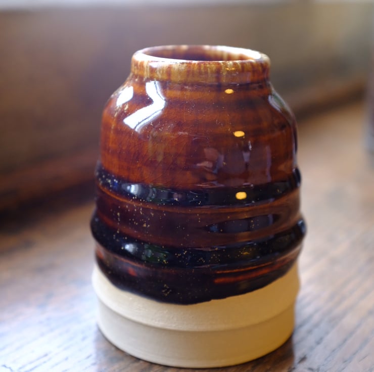 A small handthrown, stoneware vase, glazed inside and out with glossy tenmoku, with asymmetrical drips. Glossy brown, like treacle, with ridges. Suitable as a small vase or pen stand. Height: 10cm. Base diameter: 7.5cm.