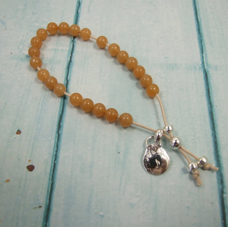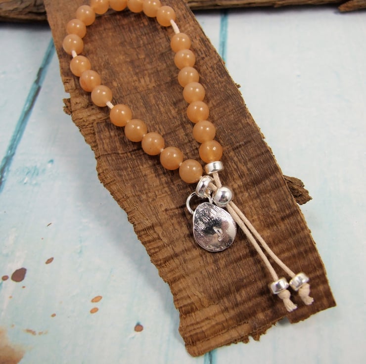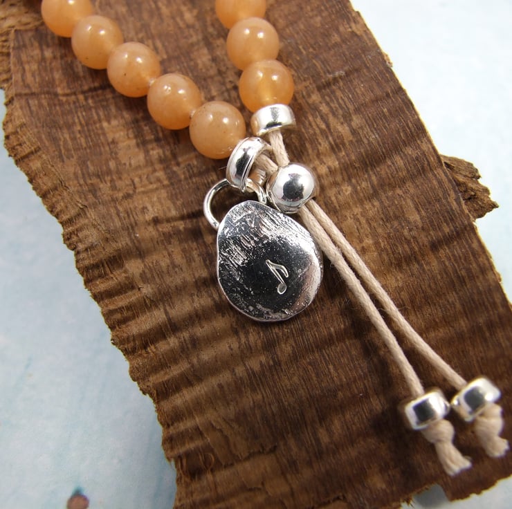 Autumnal Tone Red Aventurine 6mm beads have been threaded onto natural cotton cord. The little charm has been created using recycled silver and hand stamped with a little music note. Fitted securely to the cord.