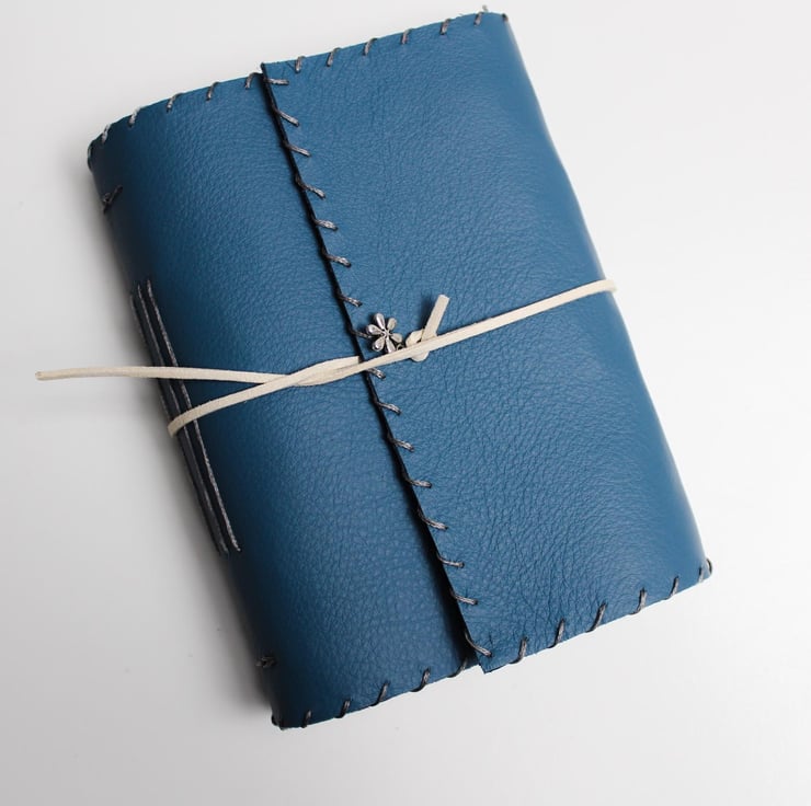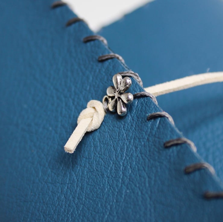 A beautiful and very soft blue leather with a colourful floral material lining. The notebook is hand stitched around the edge and contains 200 blank sheets of recycled paper, plain paper and lined paper which are then hand stitched to the leather in 5 signatures, each signature contains a mixture of the 3 types of paper. The notebook is fastened with a cream leather cord tied loosely at the front and flower charm added to complete the look.