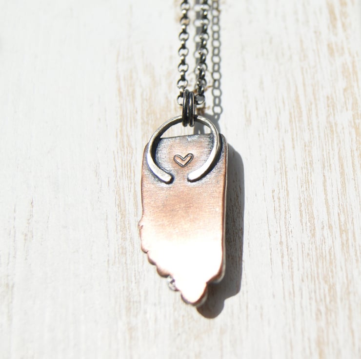Handmade in a mixed metal setting - sterling silver 925 and pure copper. It has a hand-stamped heart at the back.