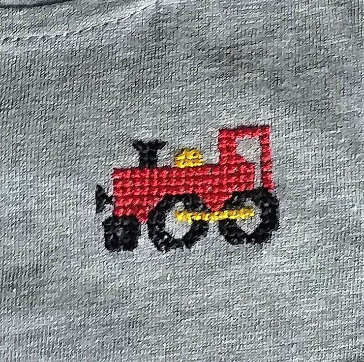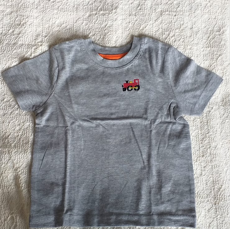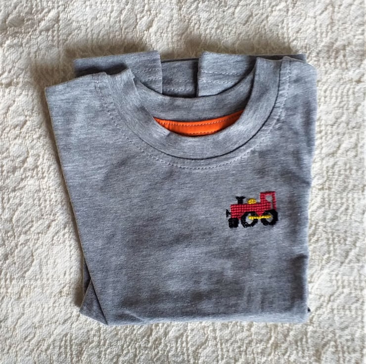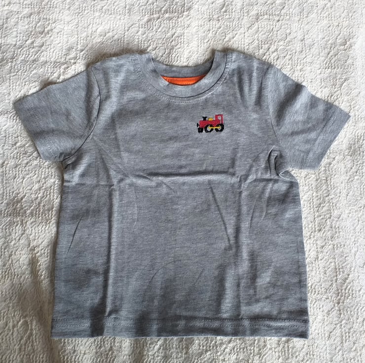 This is a grey T-shirt (age 12-18 months) upon which I have hand-embroidered a red toy engine with golden yellow dome and piston rod. The shirt is cotton viscose and machine washable to 40C.