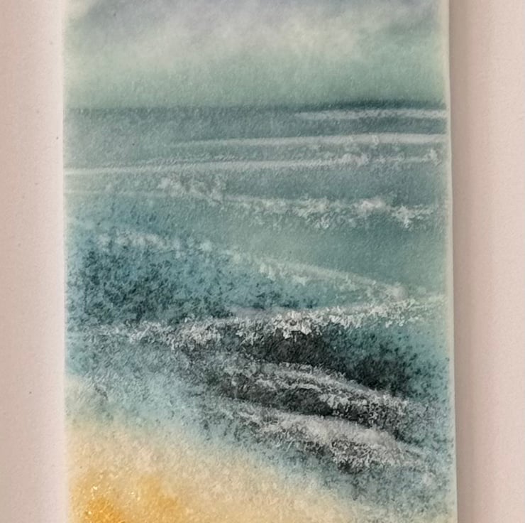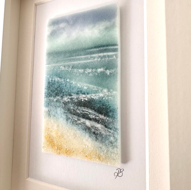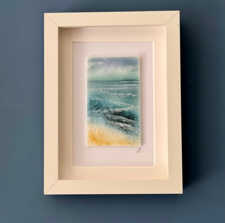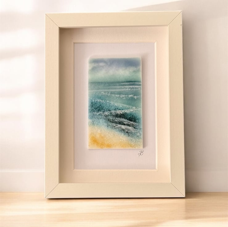 Beautiful vibrant fused glass seascape picture, with gorgeous turquoise blue sea and grass cliff top Made from glass sheets, stringers and small glass pieces, fused in the kiln for 34 hours, over 2 firings. The glass is approx 15x10cm, mounted in a white mount and frame.