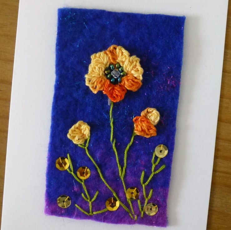 This is a unique card made from handmade felt. A beautiful orange flower has been embroidered onto a piece of sparkly blue and purple felt. The design has been embellished with beads and sequins.