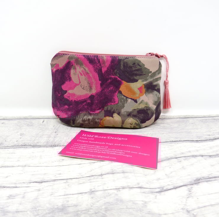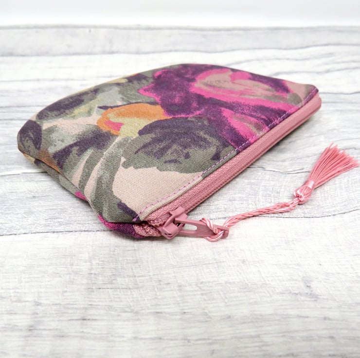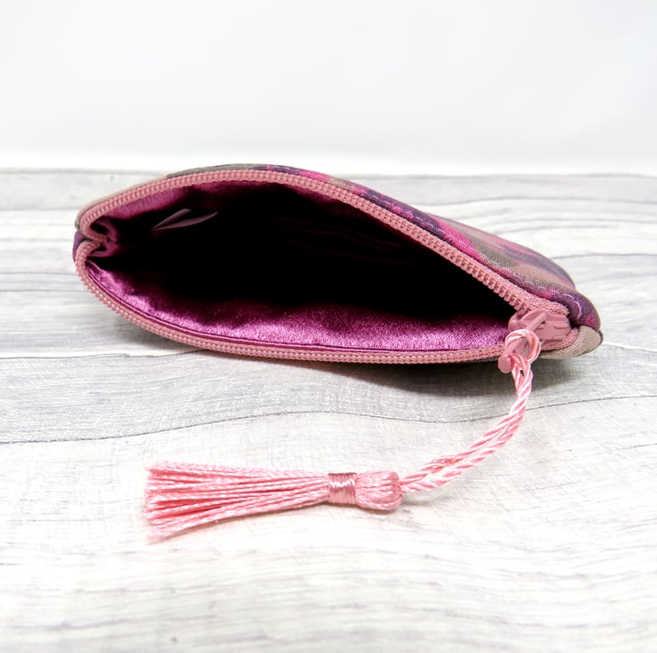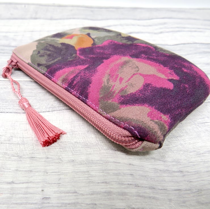This pretty coin purse has been made in a lovely floral silk in muted shades of pink, orange and green. It's lined in a dusky pink satin and the toning zip has a pink tassel zip pull. The purse is lightly padded for an extra touch of luxury and is presented in a gold organza bag making it ideal for gifting.
