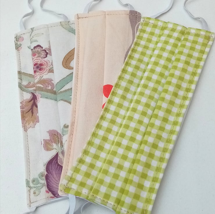 Face masks trio, pleated face coverings made from 2 layers of cotton fabric with elastic.