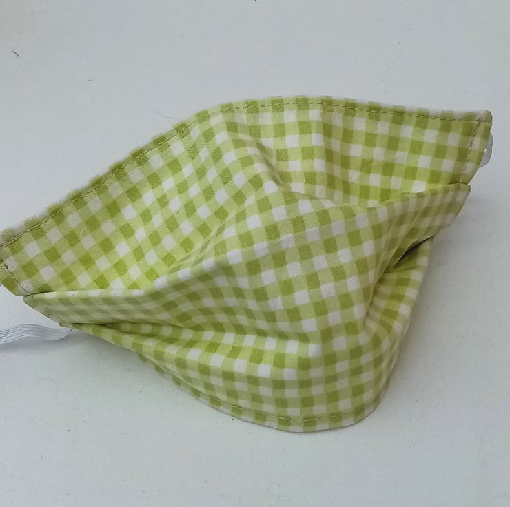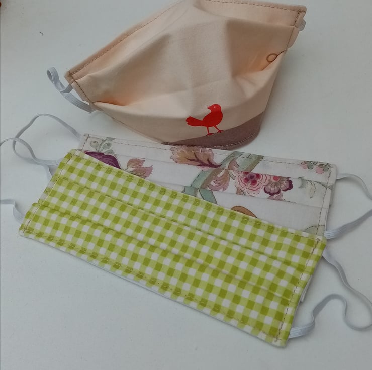 Face masks trio, pleated face coverings made from 2 layers of cotton fabric with elastic.