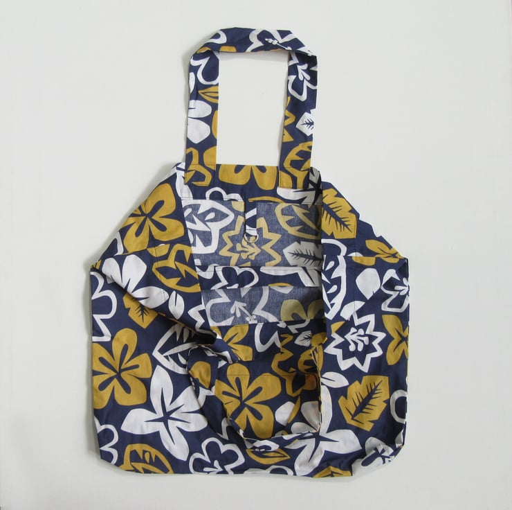 DESIGN: - Large capacity bag - Quick dry fabric - Lightweight - Folds small enough to fit in a handbag - Handles long enough to wear on the shoulder - Internal pocket - D-ring for attaching keys - One-of-a-kind, made with a fabric remnant, virtually no waste (just tiny slivers)