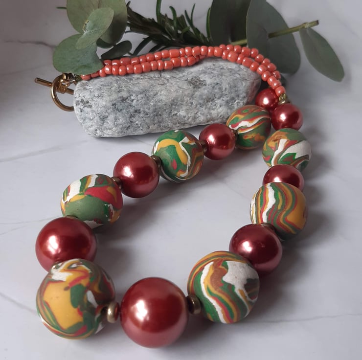 A statement necklace using a mix of red, sage and forest green, mustard yellow and white polymer clay with a hint of gold in a unique swirl pattern.