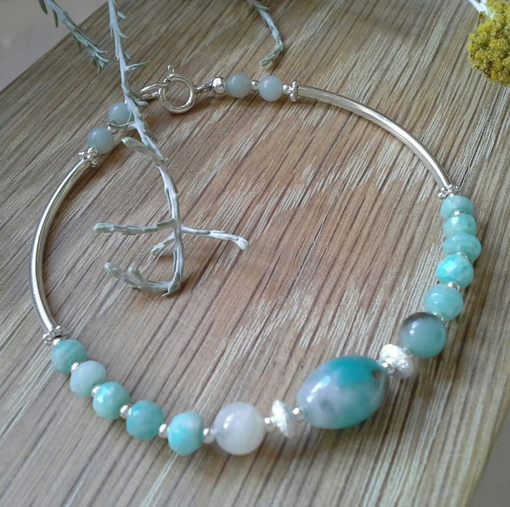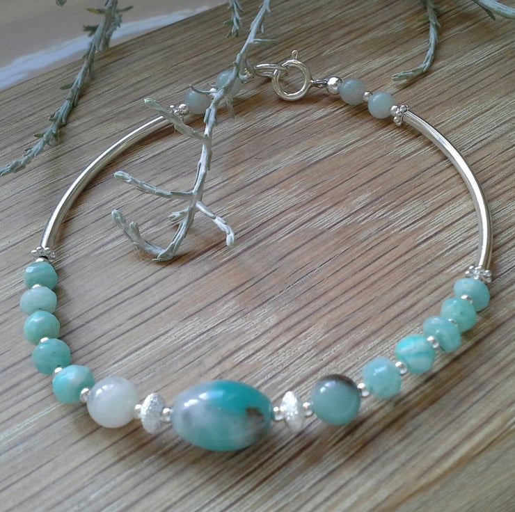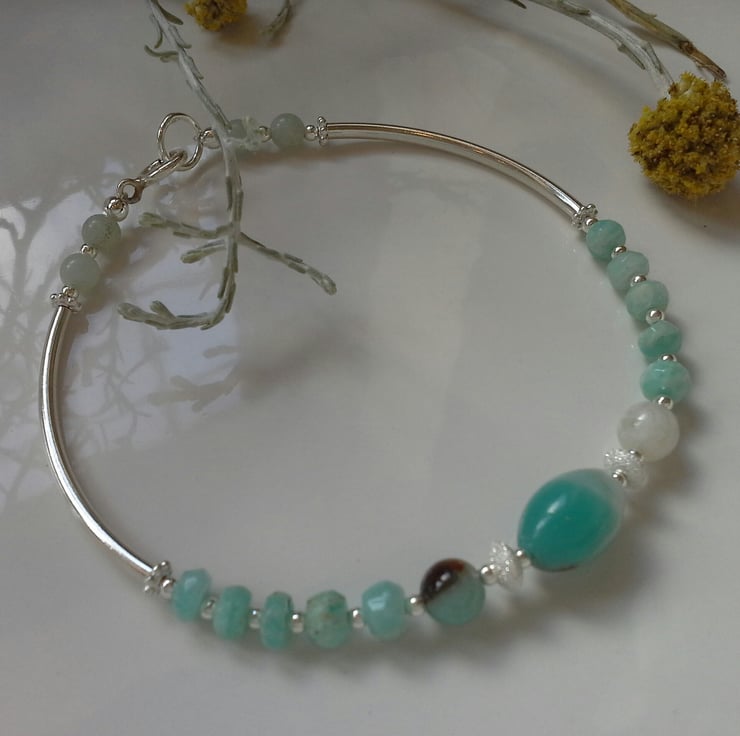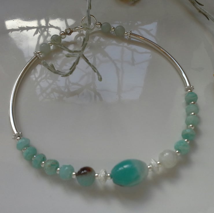 A beautiful dainty looking amazonite bangle style bracelet designed and hand crafted to be worn on it's own or to add with other delicate bracelets. All outer components are 925 sterling silver.