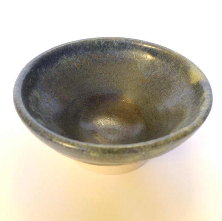 Small, hand thrown, stoneware dipping dish. Blue (foodsafe) glaze inside and out. Great for sauces, or for holding trinkets. Height: 4.5cm. Diameter: 10cm.