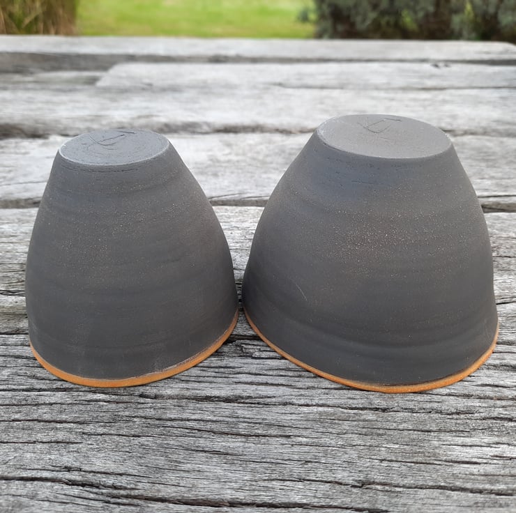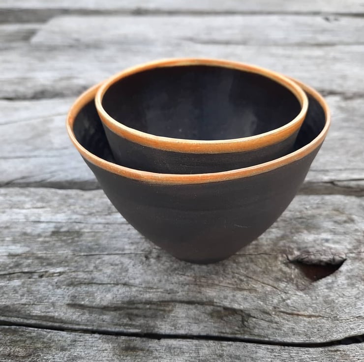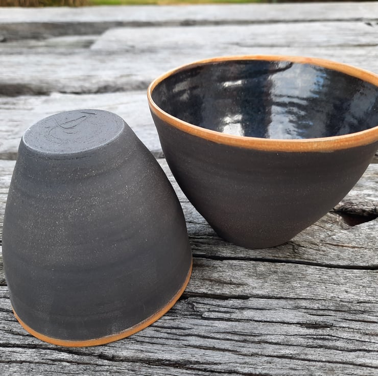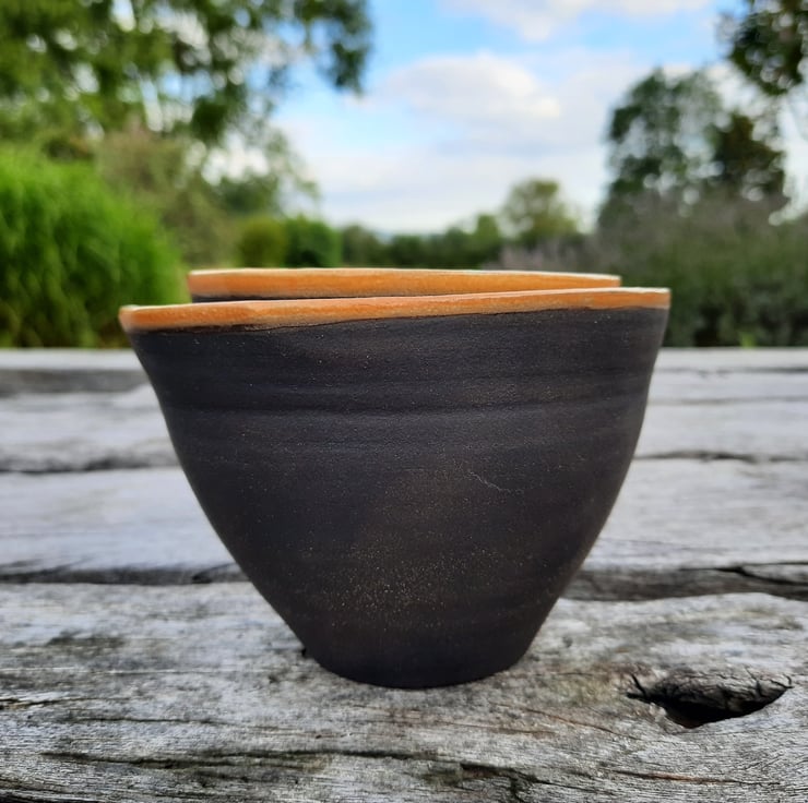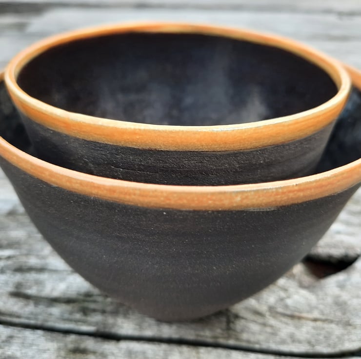 Two small black clay nesting bowls. I have used a glossy dark glaze on the inside (with a coloured rim) allowing for food use and I have left the outside with no glaze to show the beautiful natural texture and colour of the clay.