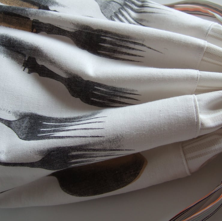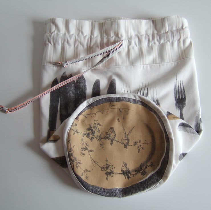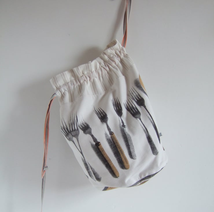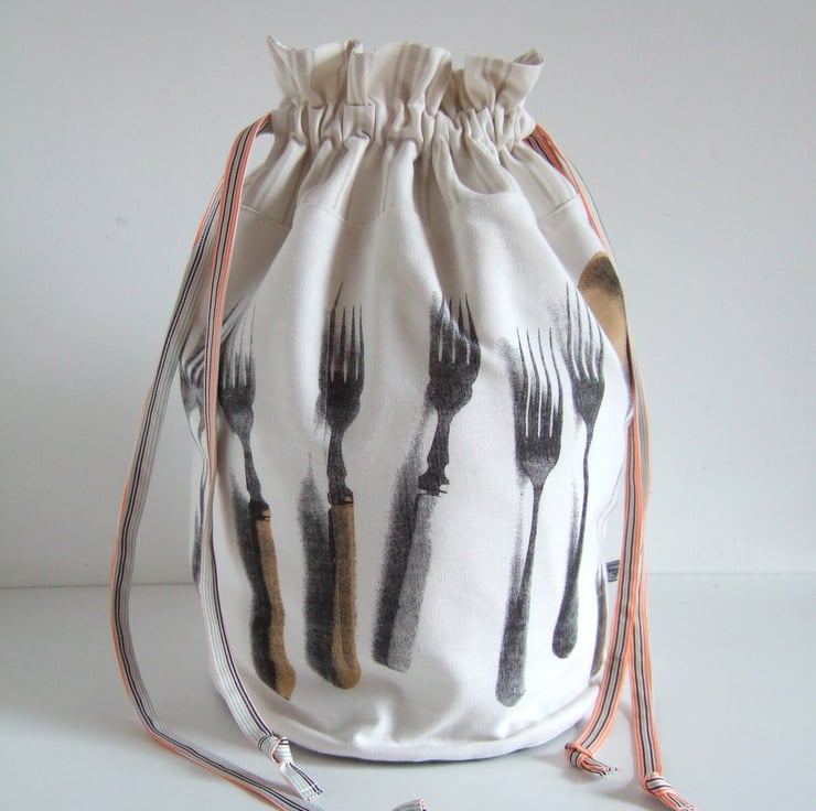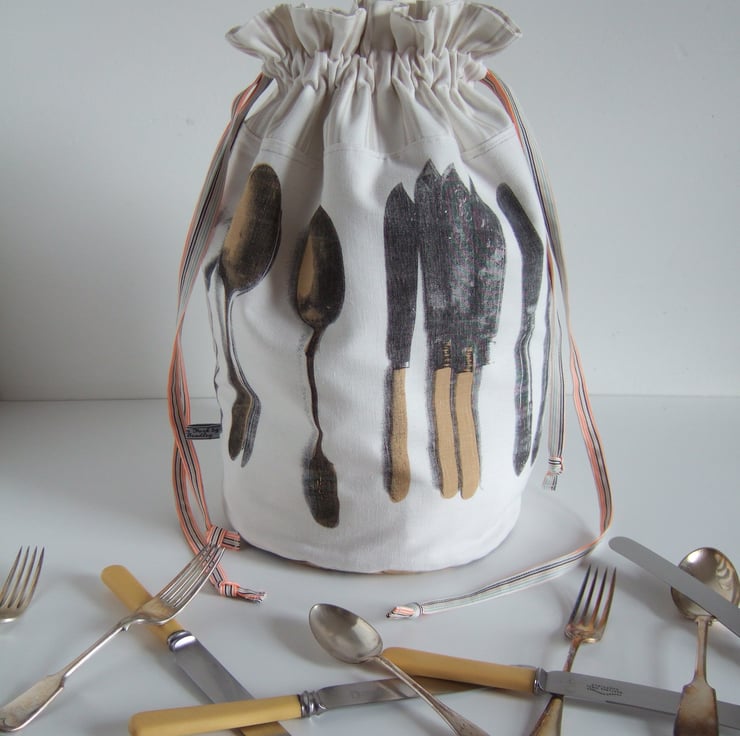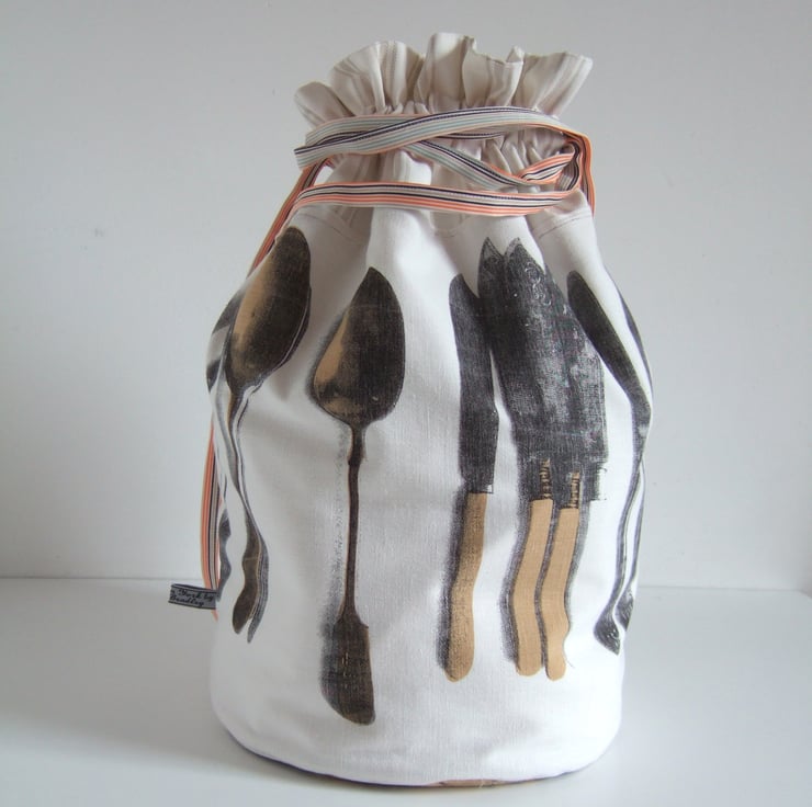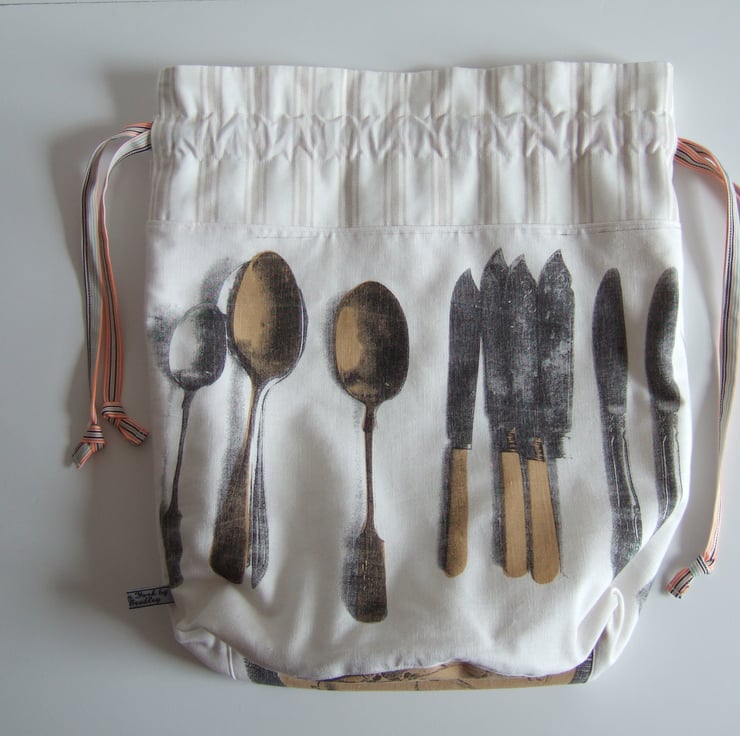 An unusual cutlery print, featuring knives, forks, spoons and a plate or two, wraps around this drawstring bag. Made from a vintage table runner I found at York car boot, it’s a perfect drawstring bag for small amounts of laundry or clothes storage. This quirky print has been designed to give a handprinted look, and I have incorporated two plates into the base of the bag and its lining! This would make a great present for an aspiring chef, as a going to Uni present, or for anyone with a cutlery fetish!