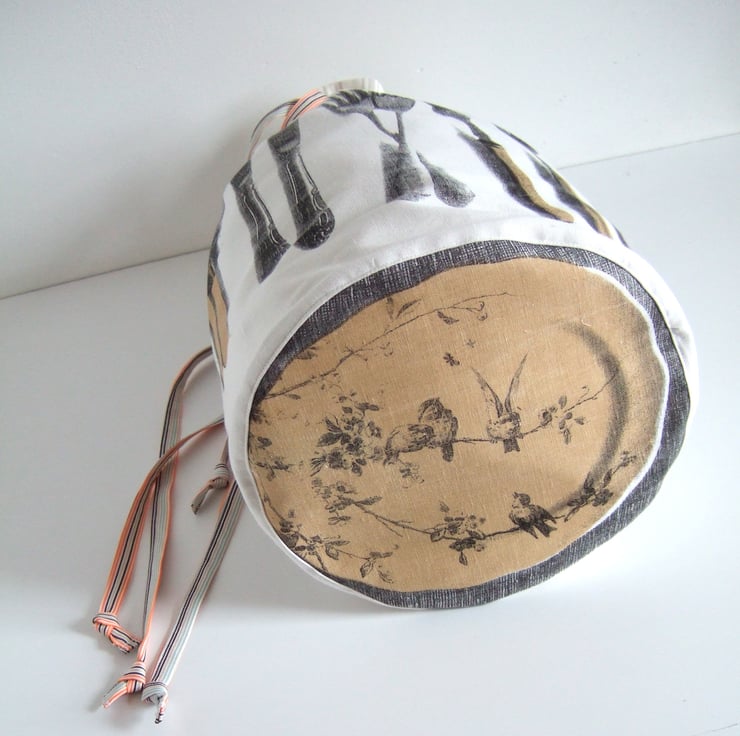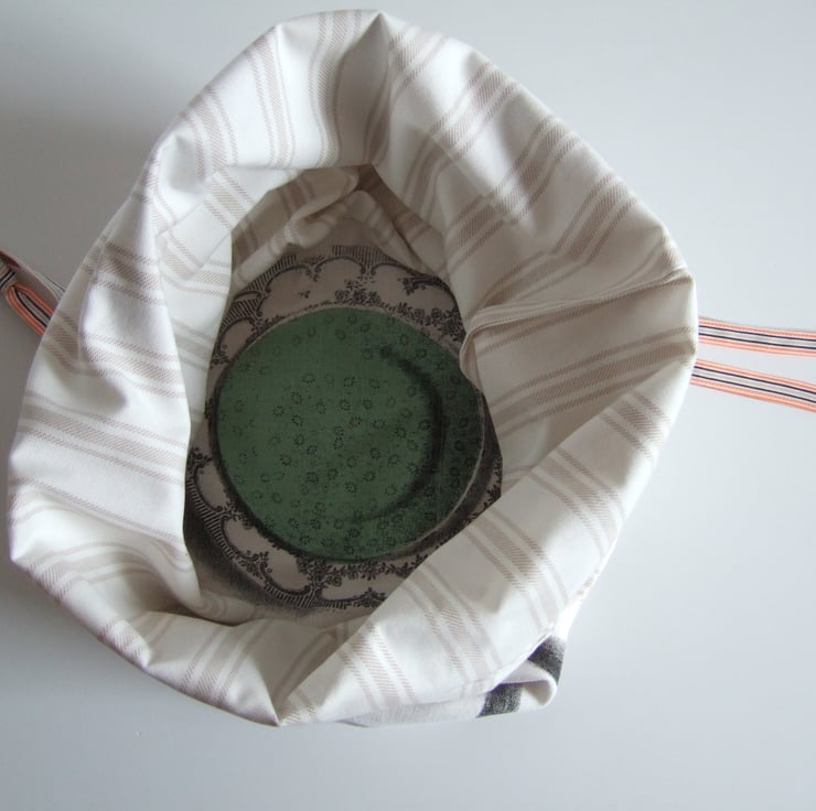 It is fully lined with an Ikea striped fabric remnant from my new curtains! and I have made the ties from the striped rufflette trim from some vintage Habitat bedlinen. The ties hang down approx 50 cm on either side when the bag is drawn up.