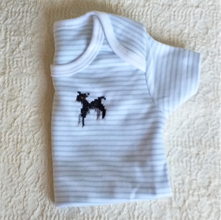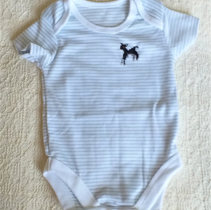 Such a cute little white vest/onesie with thin blue stripes for a tiny boy (or girl!). I have hand-embroidered a black lamb on the left breast. The vest, by Tu, is 100% cotton and machine washable. It has an envelope neck, for ease of putting on and taking off, and three press-studs between the legs
