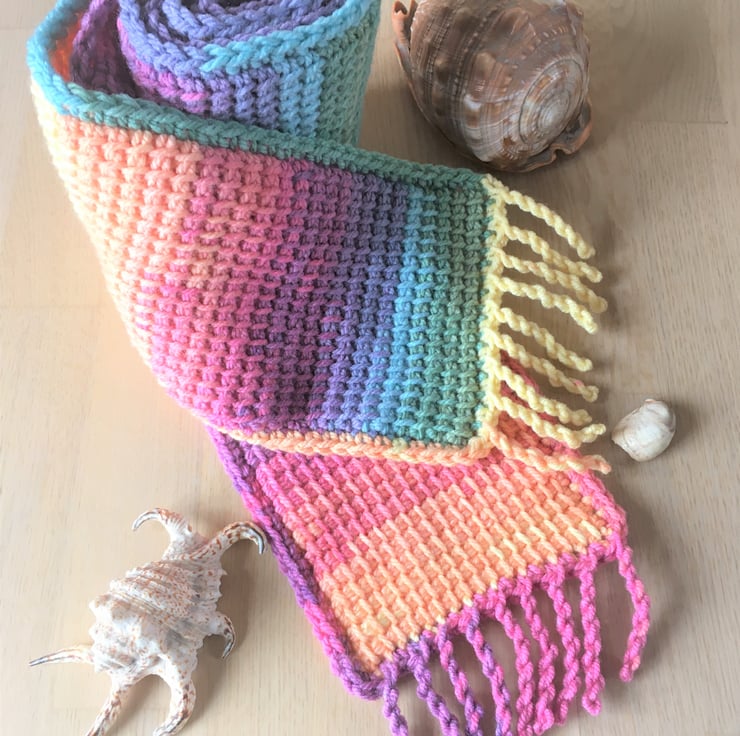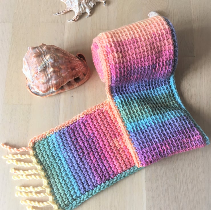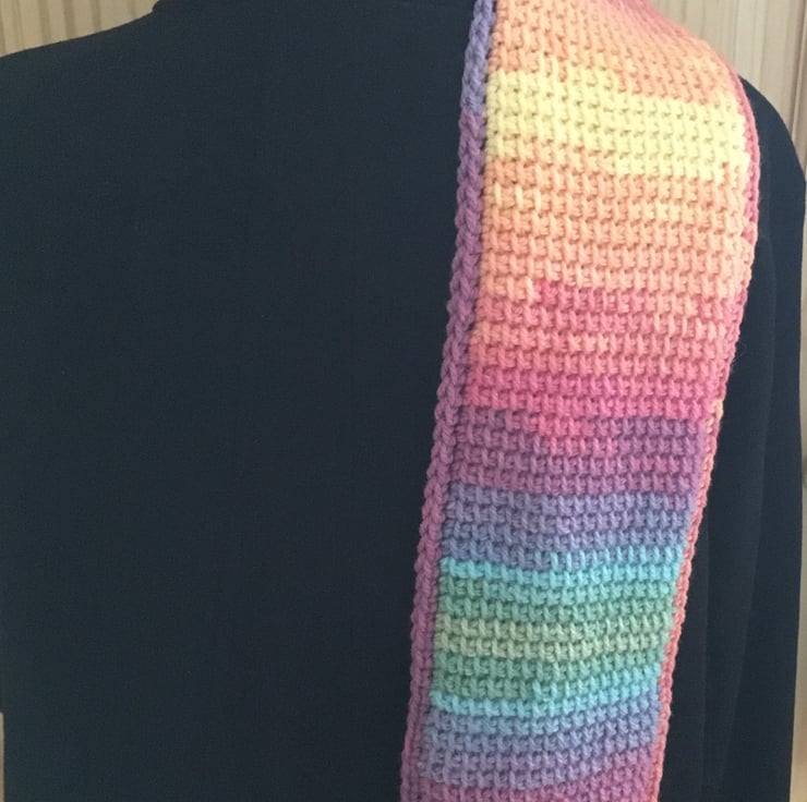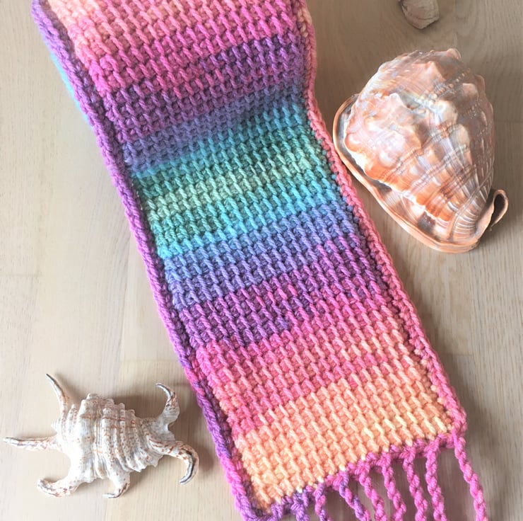 I crocheted this is a super cosy, rainbow scarf using a crochet technique called Tunisian crochet. It will keep you warm through Autumn and Winter. It would be great as a gift for a friend, a student or any rainbow lover.