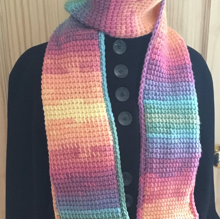 Having made a previous rainbow scarf using Tunisian crochet and having had to sew in loads of ends, I was delighted to find this already made rainbow chunky yarn. This soft cosy scarf is the result.