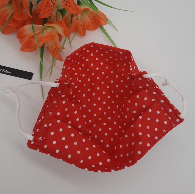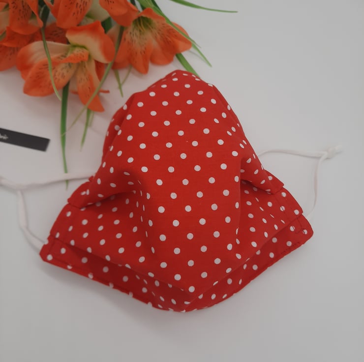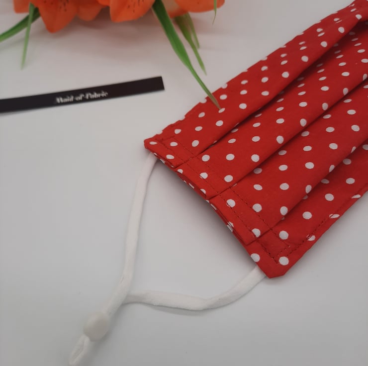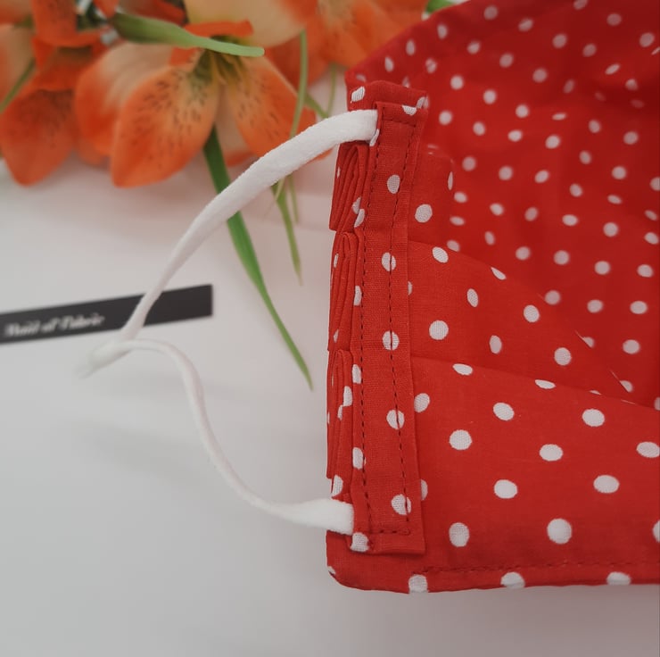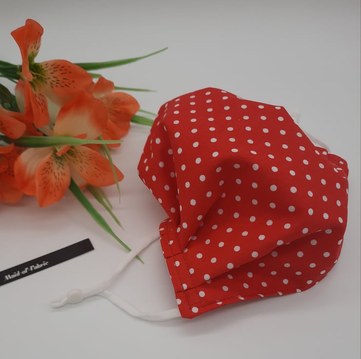 Face mask made using a red and white polkadot cotton fabric, adjustable soft white elastic and a 9cm flat bendable nose wire.