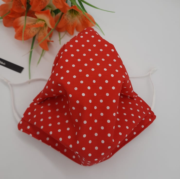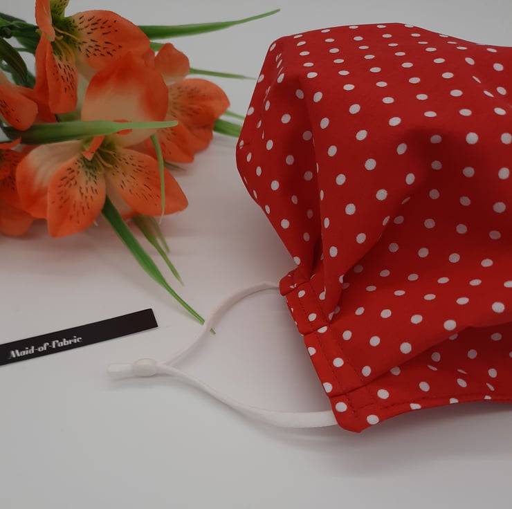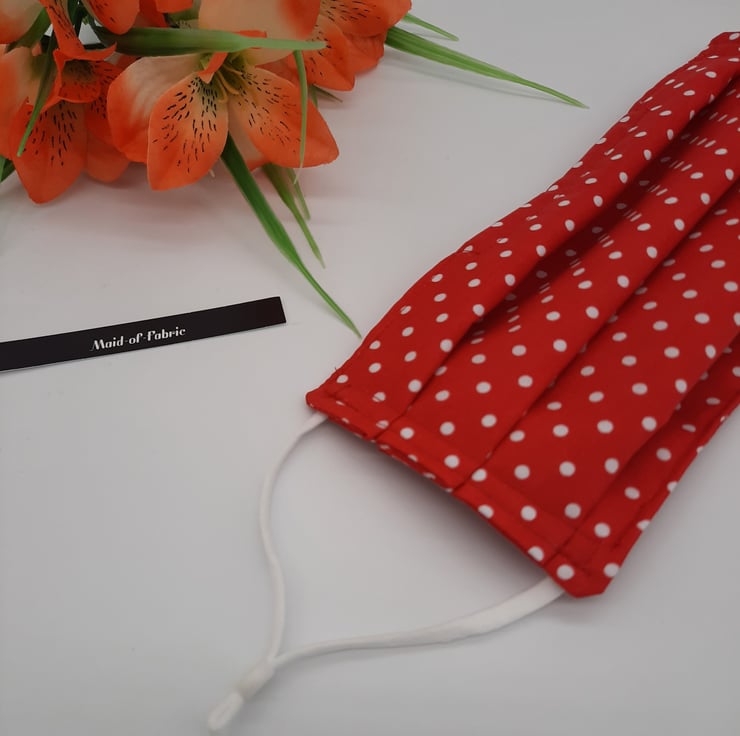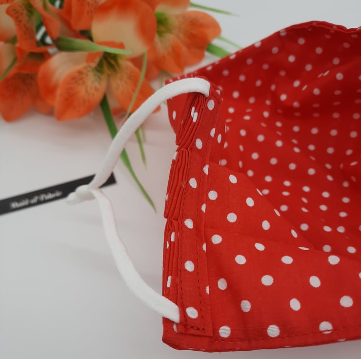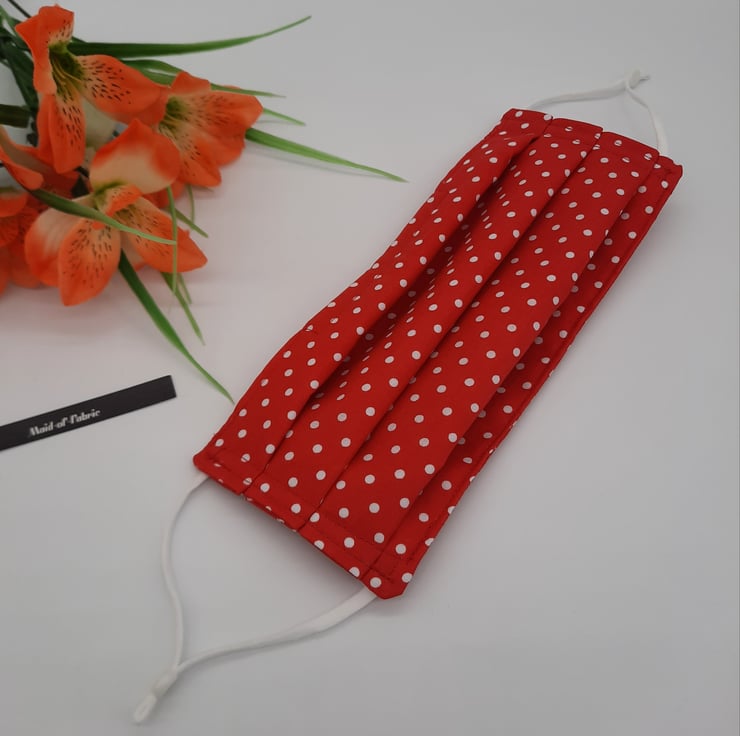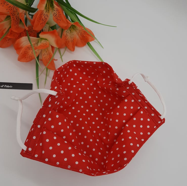 Face mask made using a red and white polkadot cotton fabric, adjustable soft white elastic and a 9cm flat bendable nose wire.