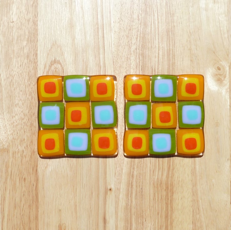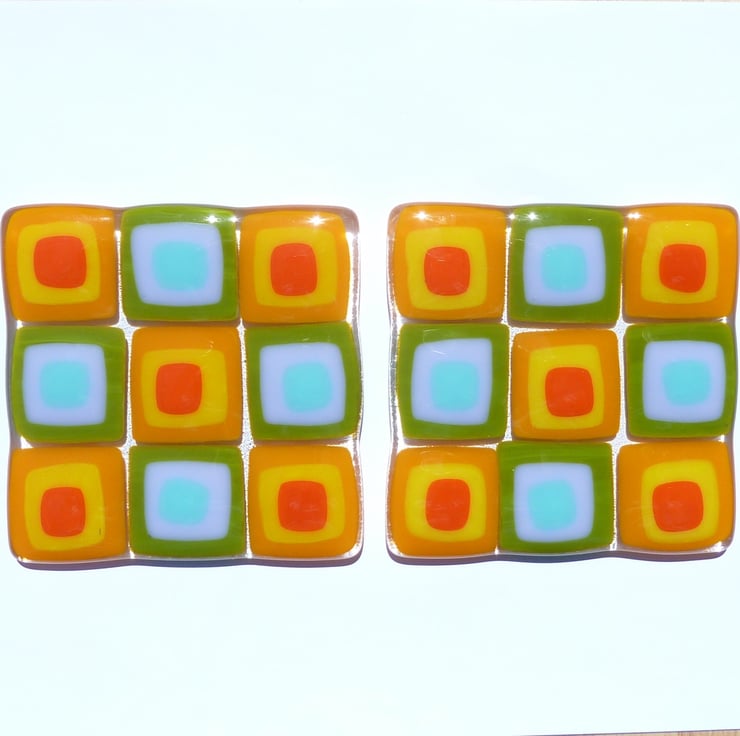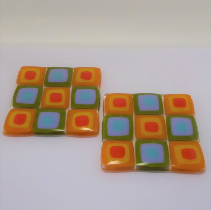 A set of two fused glass coasters in bright colours. Each coaster has a design of contrasting squares upon squares using the colours of a rainbow.