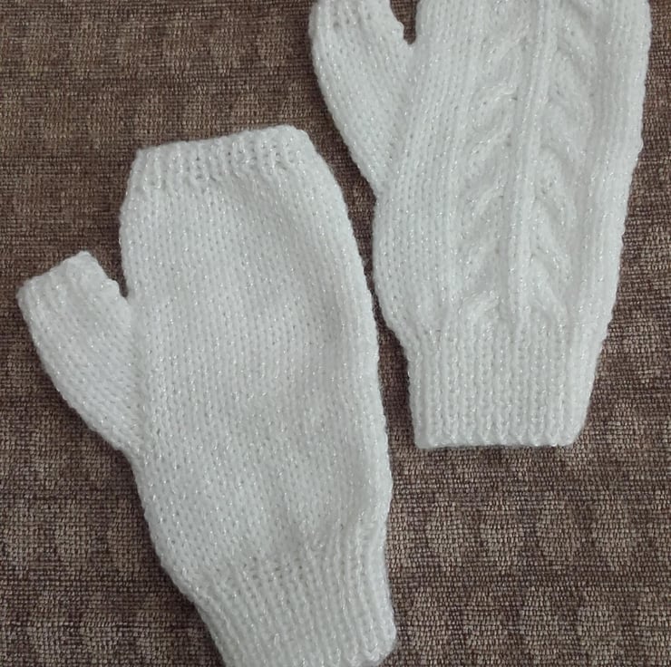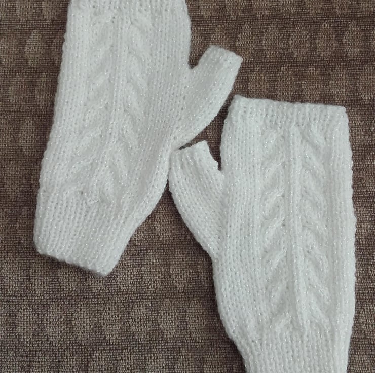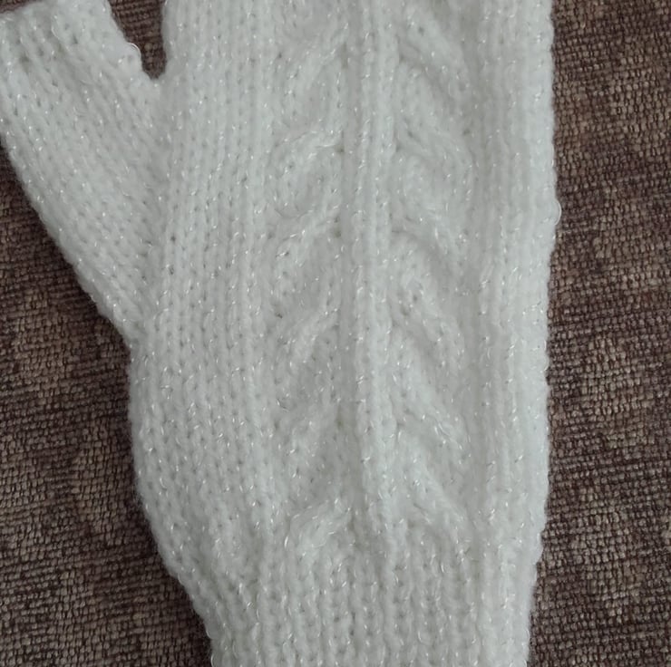 A warm pair of wrist warmers / fingerless gloves with an attractive cable design on the back.
