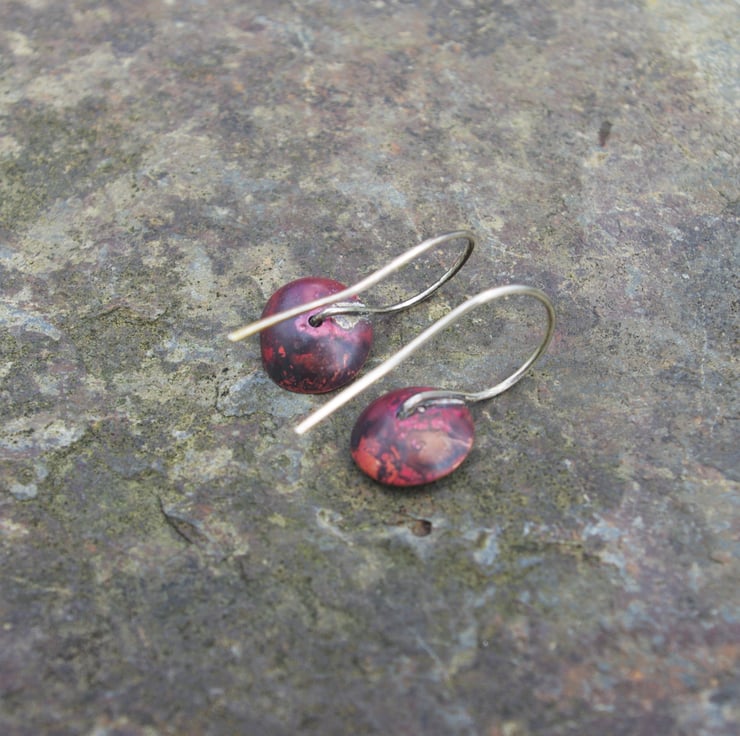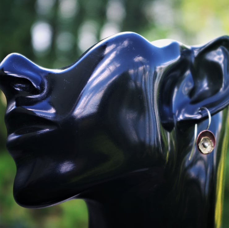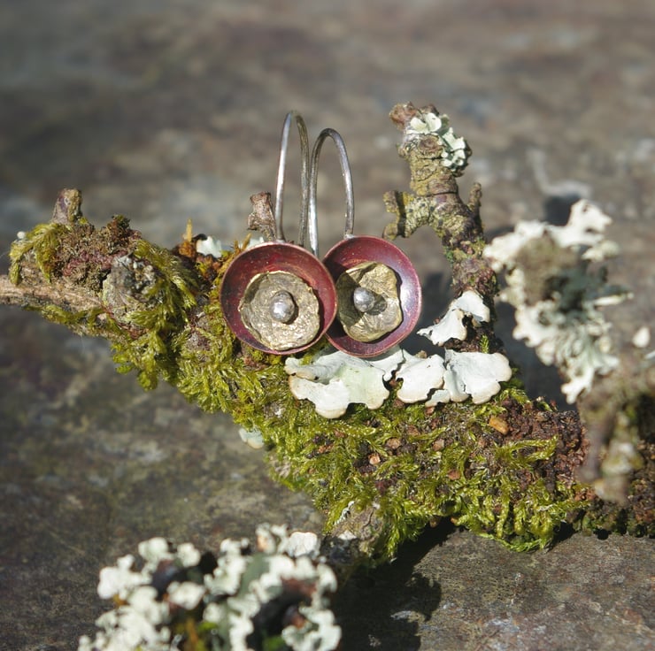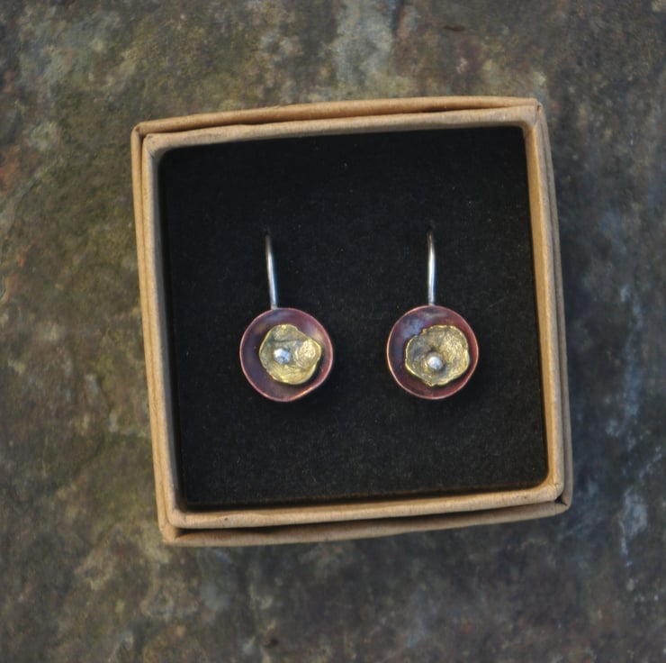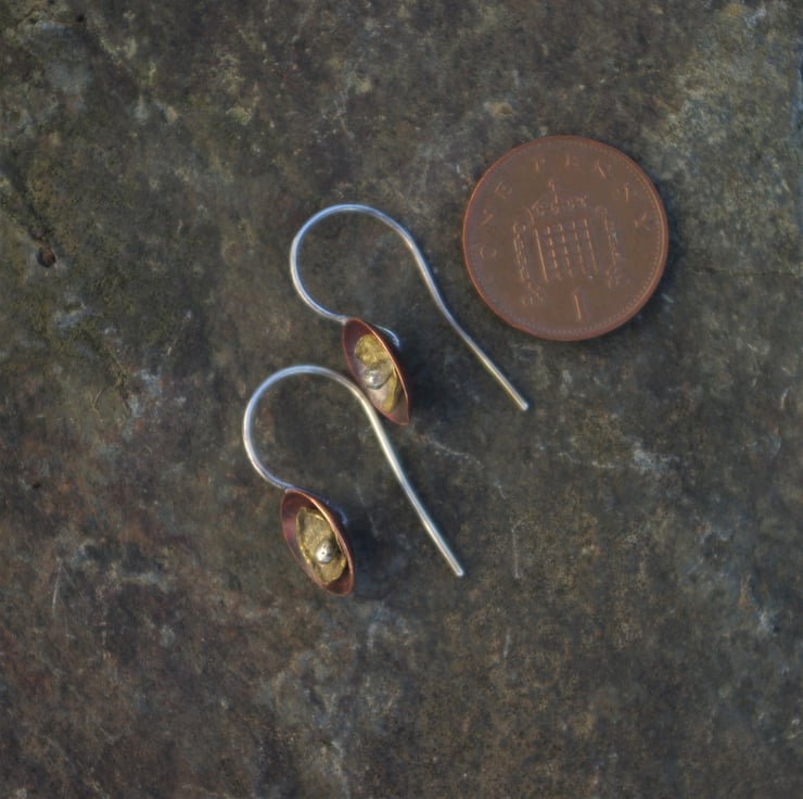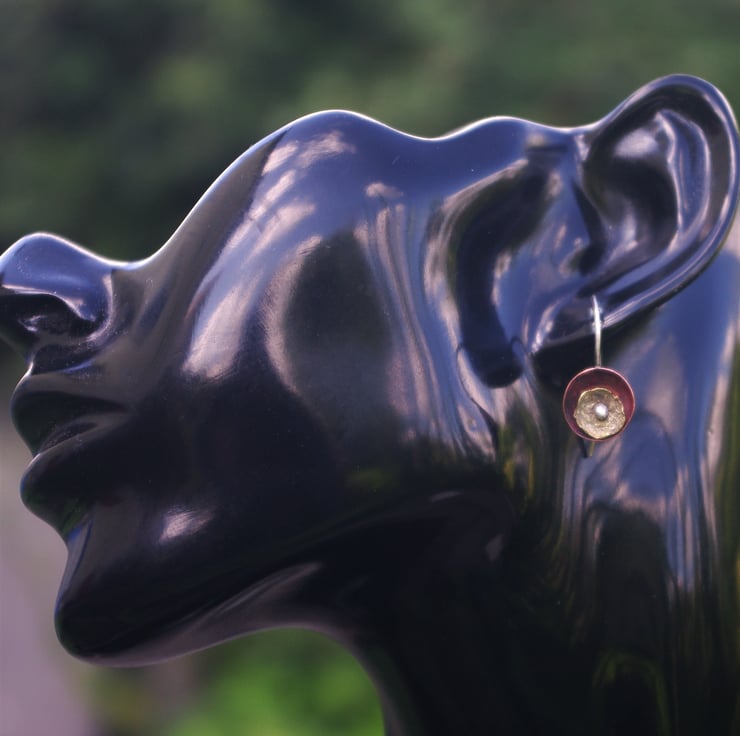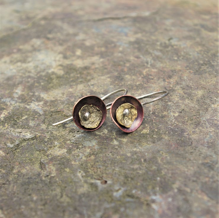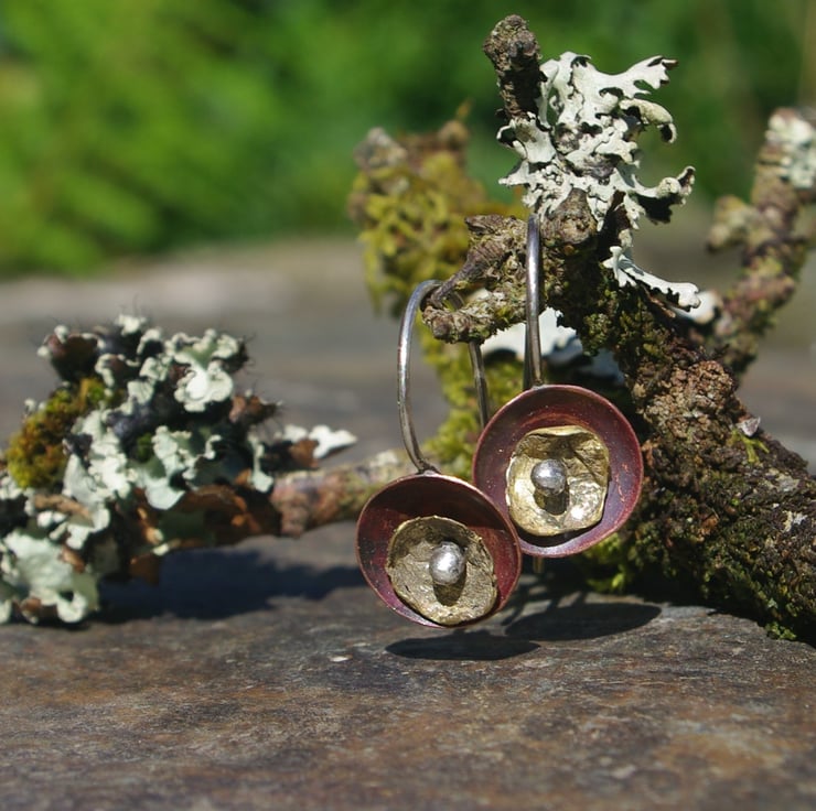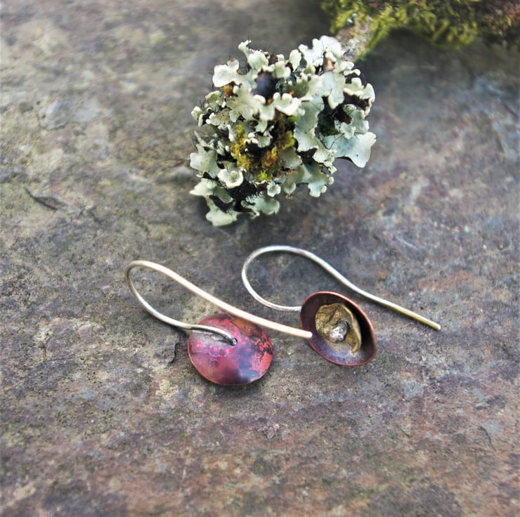 A copper cup dangles from a handmade sterling silver ear hook. I have used heat to create deep tones of red on the copper. The organic, lichen inspired smaller brass cup is kept in place in the centre of the copper cup by the blob of silver on the end of the silver ear hook.The earhook is soldered to the back of the copper , so that the earring stays in a vertical position.
