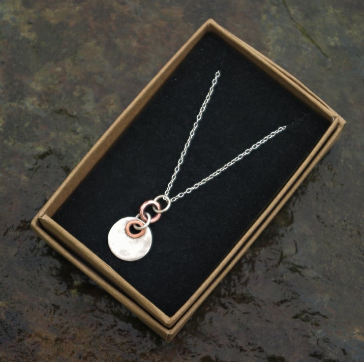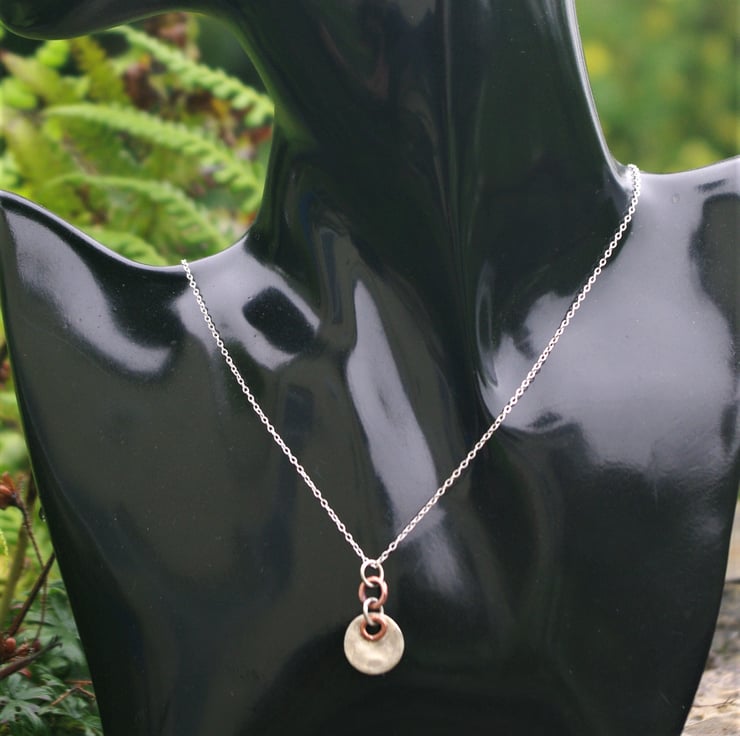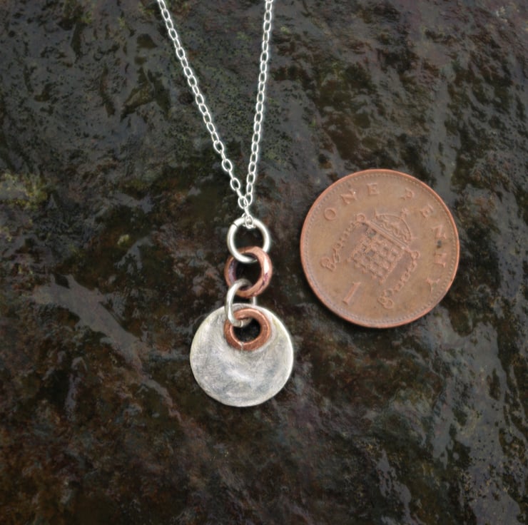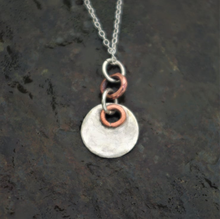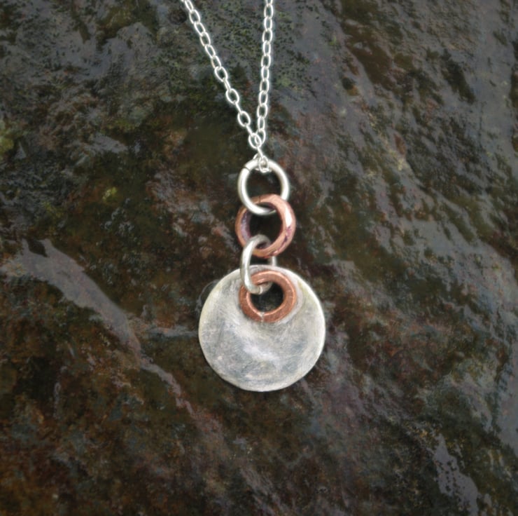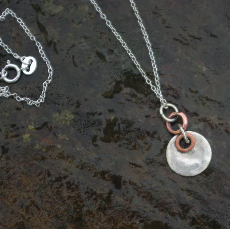 A small, slightly hammered, delicate silver circular disc with inlaid copper circle, hangs from a silver chain, joined by a second copper ring. The copper is in its raw untreated state. All silver is sterling silver