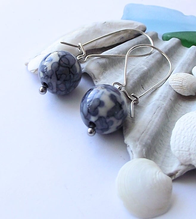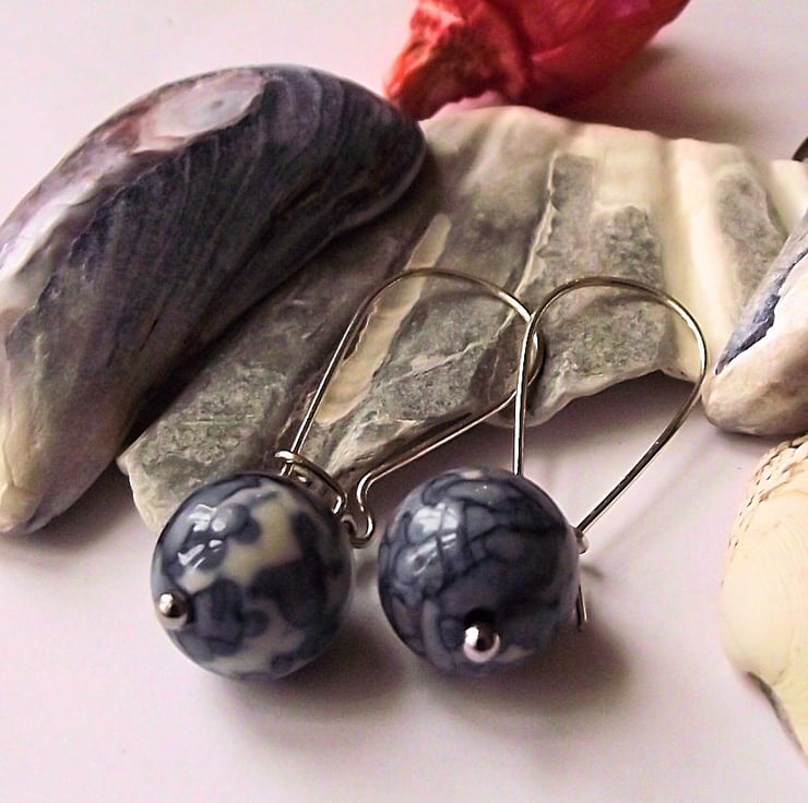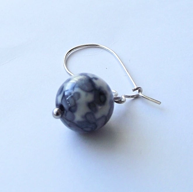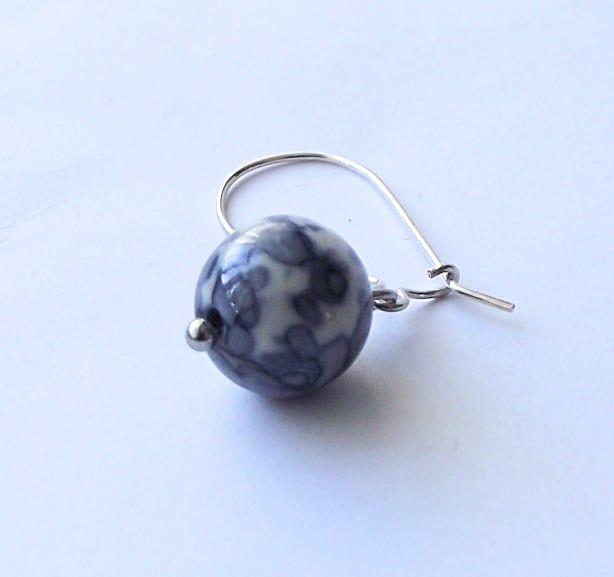 Porcelain-like blue ocean jasper earrings with sterling sliver handmade kidney earwires. Stainless steel bead post. Earring drop 37mm