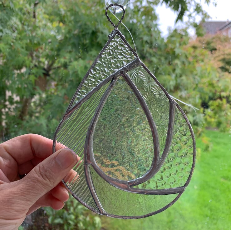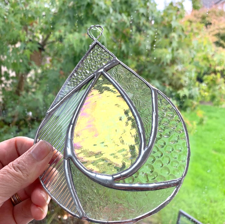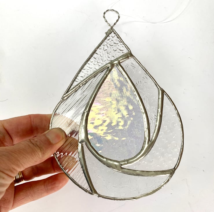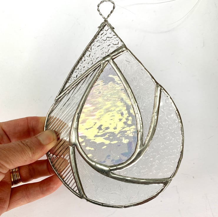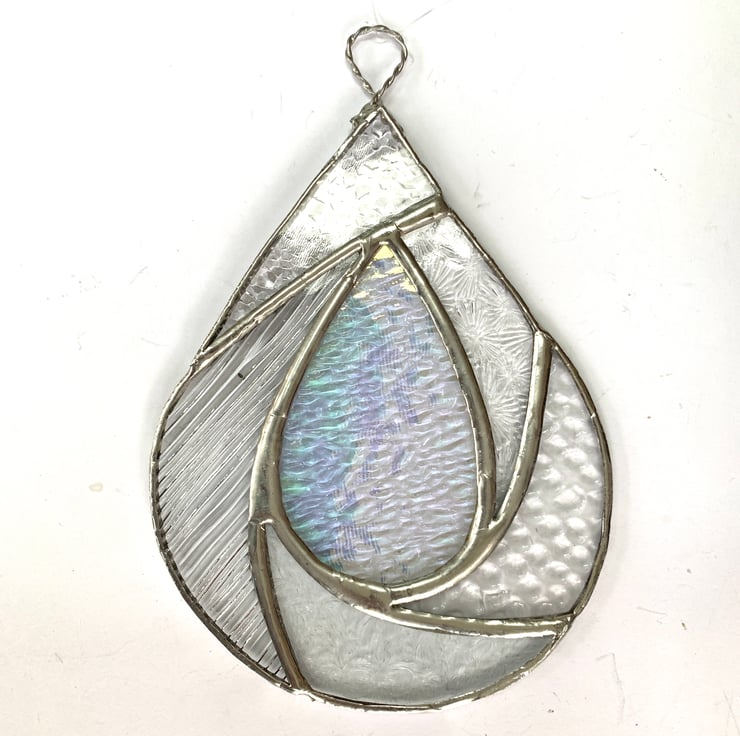 This suncatcher has been made from different types of clear textured stained glass with clear irriedised glass in the centre of the raindrop.