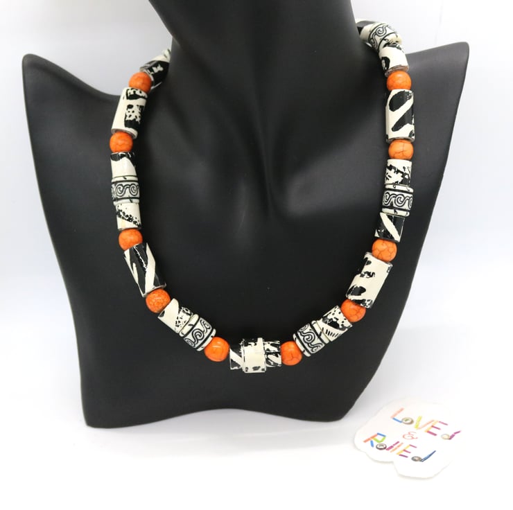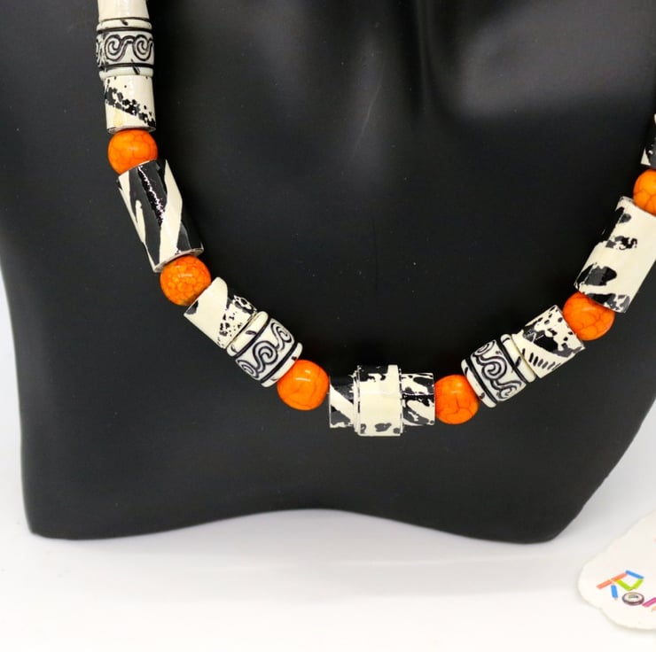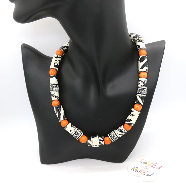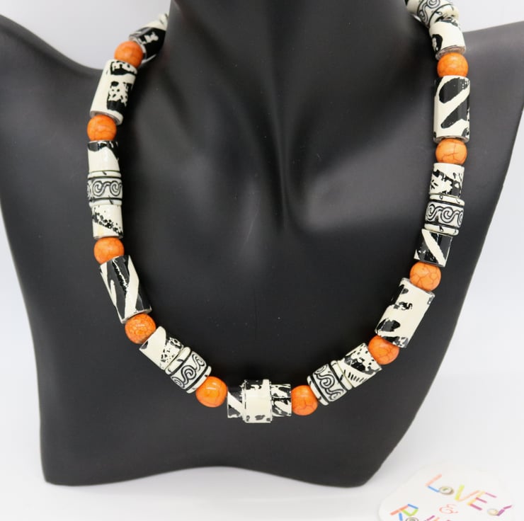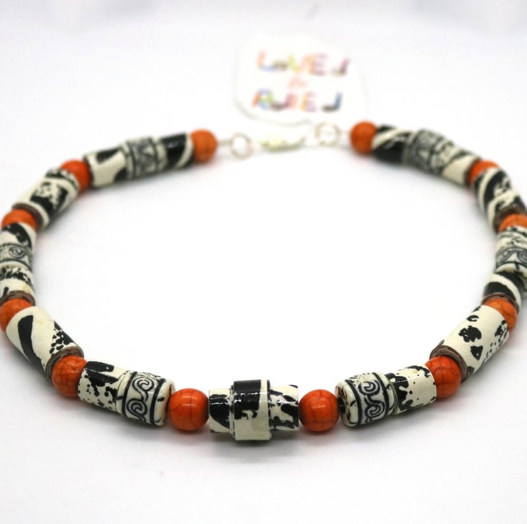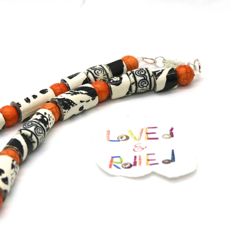 An unusual and unique collar necklace made with paper beads. An old black and white sample of wall paper was manually cut into strips, handrolled into different size tubular beads and then varnished. When rolled, the beads had a zebra type effect and pattern so were matched with preloved plastic beads of similar design and complemented with bright orange beads - to reflect african animals and bright sunshine.