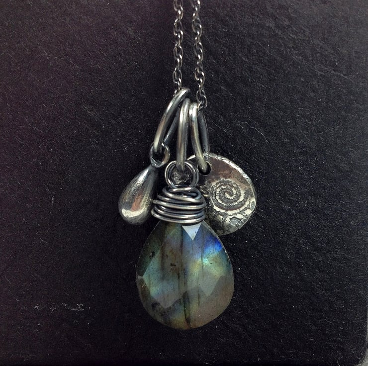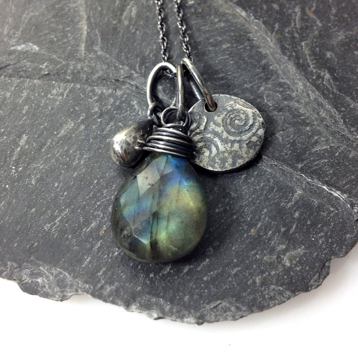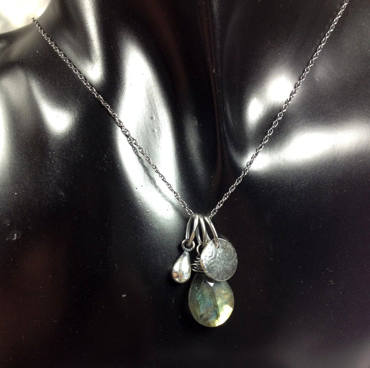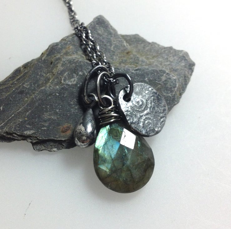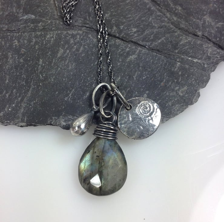 A subtle, intriguing, talismanic necklace with large faceted labradorite teardrop, small silver fragment tag and silver tear drop.