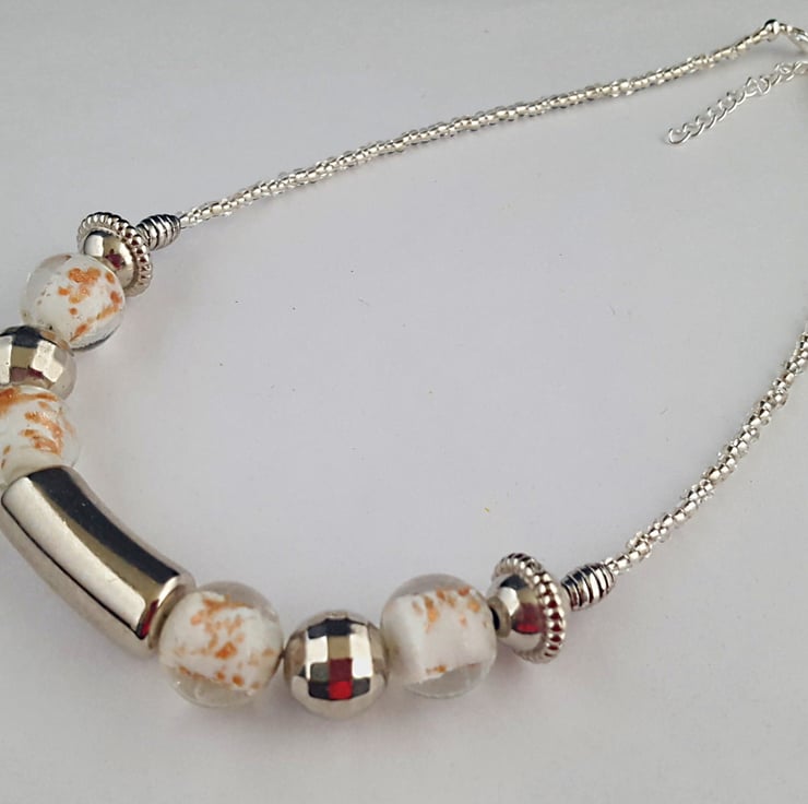 18" necklace of 15mm white/gold lampwork glass beads, silver plated beads and silver seed beads.