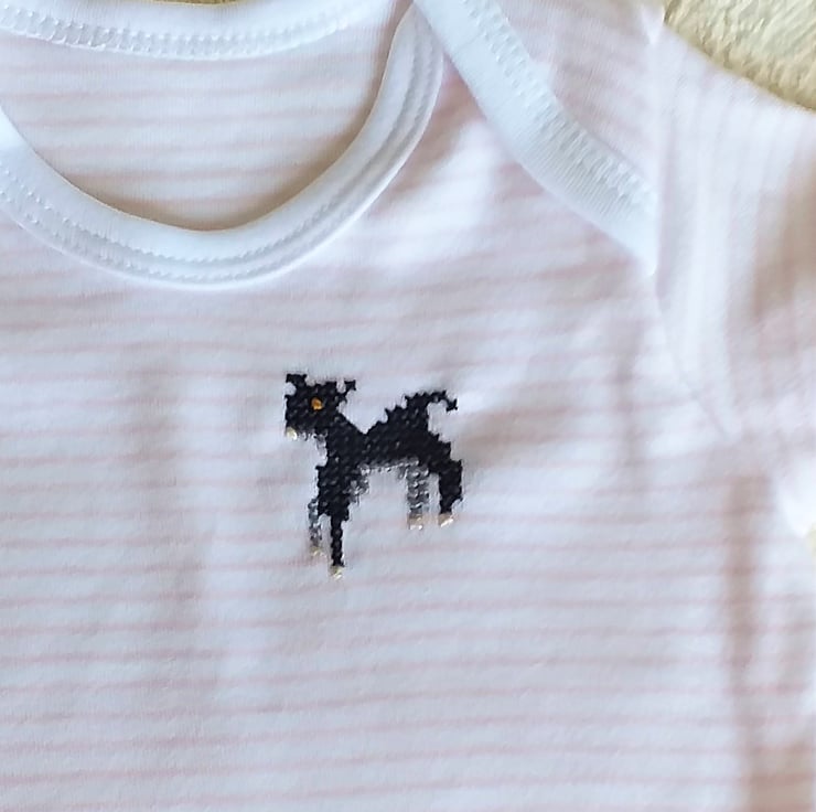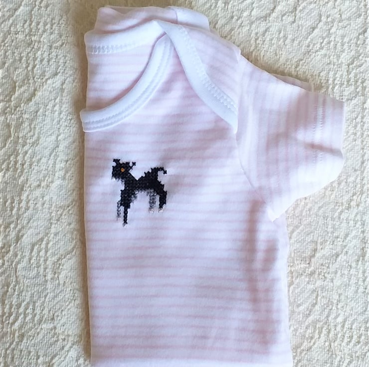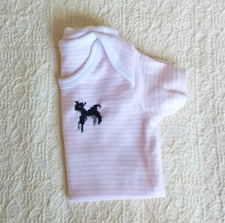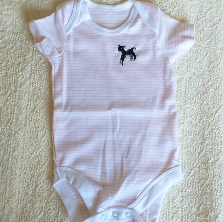 Such a cute little white vest/onesie with thin peach stripes for a tiny girl (or boy!). I have hand-embroidered a black lamb on the left breast. The vest, by Tu, is 100% cotton and machine washable. It has an envelope neck, for ease of putting on and taking off, and three press-studs between the legs.
