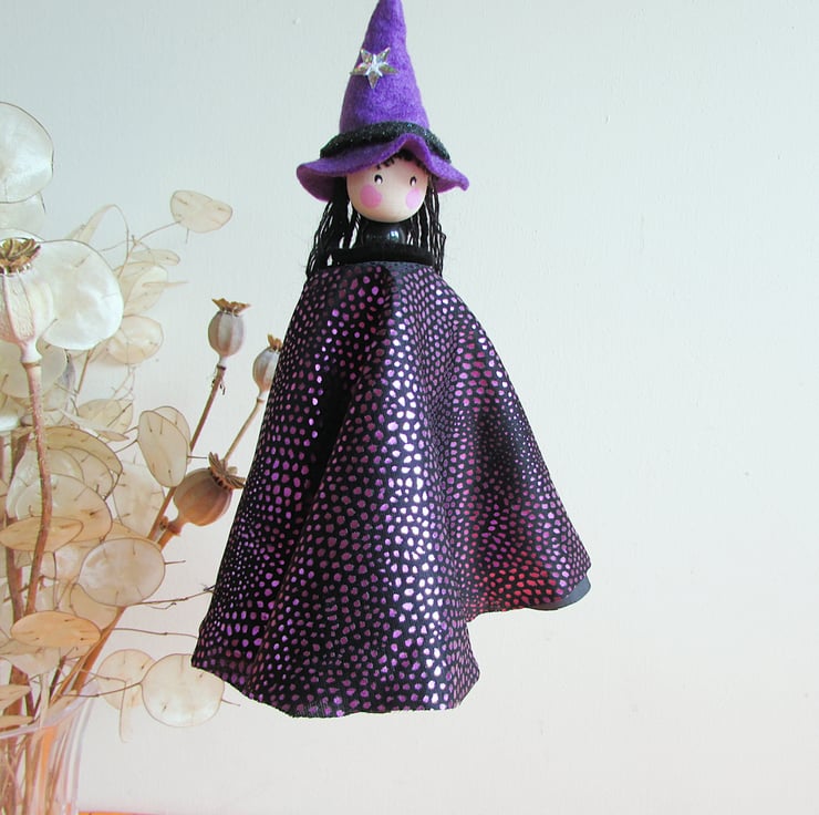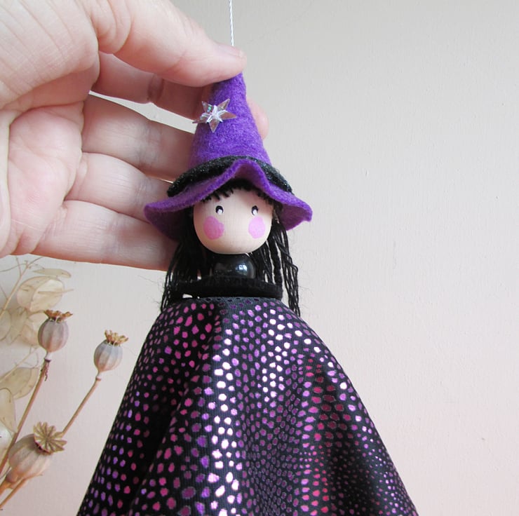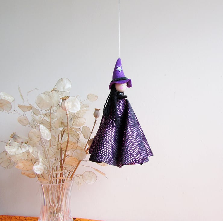 A lovely witch to hang in your home. The head is a wooden bead painted with acrylic paints, the long black hair is wool and the dress is made from a circle of pretty magenta material that sparkles . Her pointed witches hat is purple felt with a silver star and a black band.