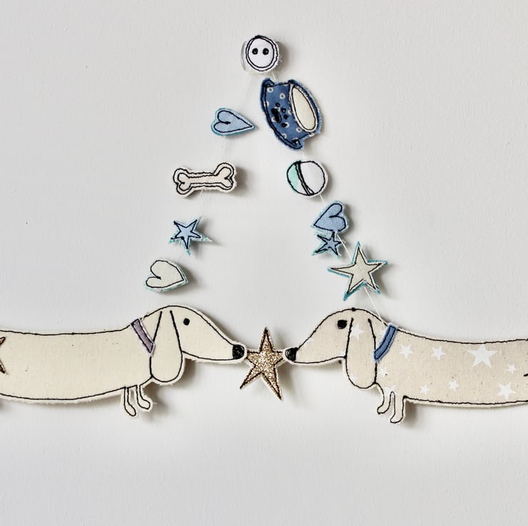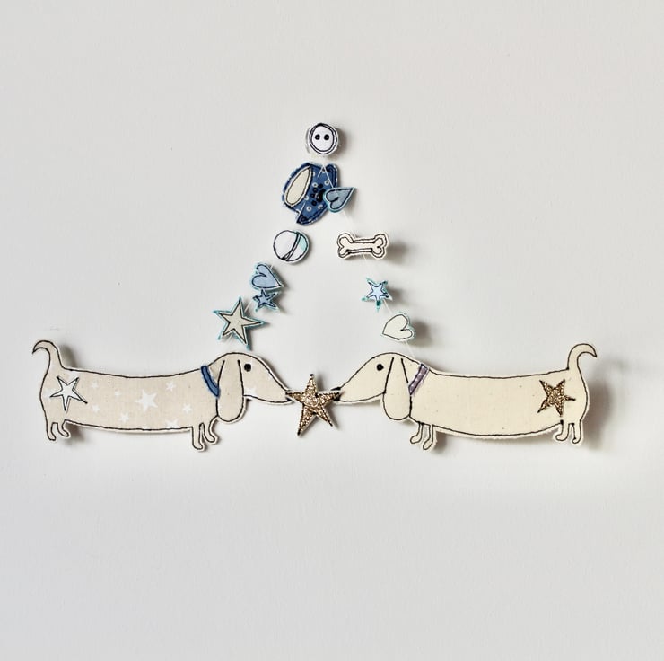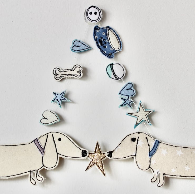 A delightful hanging decoration which is created using cotton cloth, metallic cloth, glitter cloth and free hand machine embroidery; multiple layers of cloth are sewn together and cut out by hand using very sharp scissors. With a linen thread to hang.