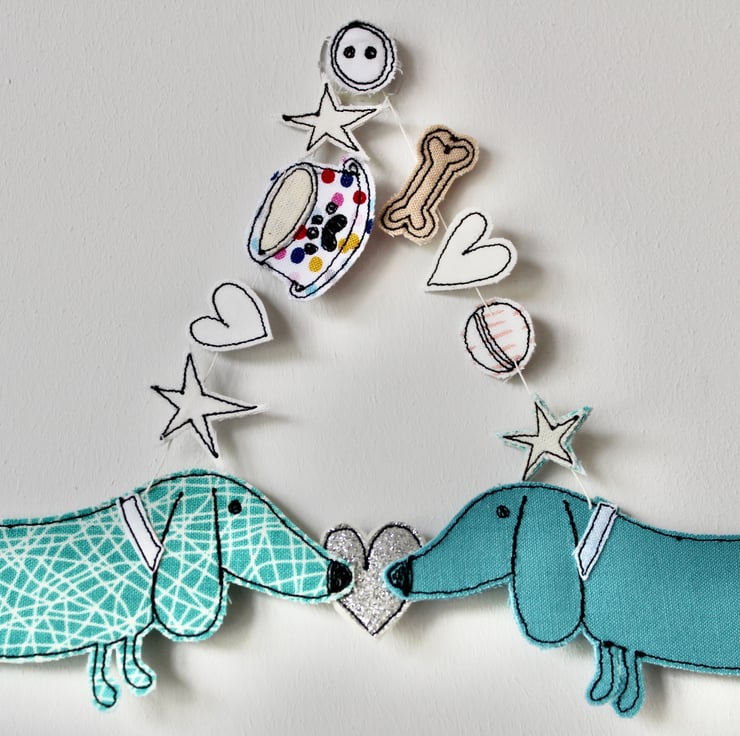 A delightful hanging decoration which is created using cotton cloth, metallic cloth, glitter cloth and free hand machine embroidery; multiple layers of cloth are sewn together and cut out by hand using very sharp scissors. With a linen thread to hang.