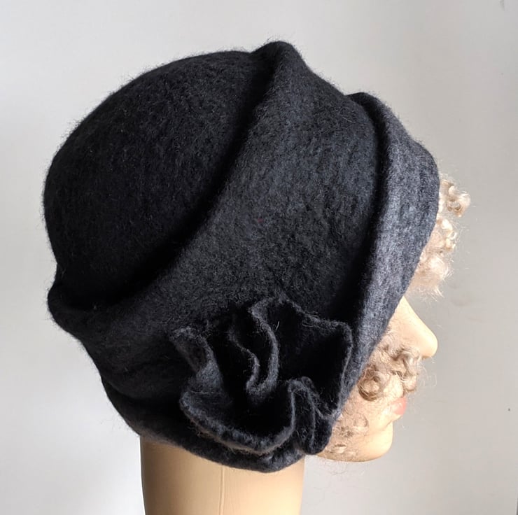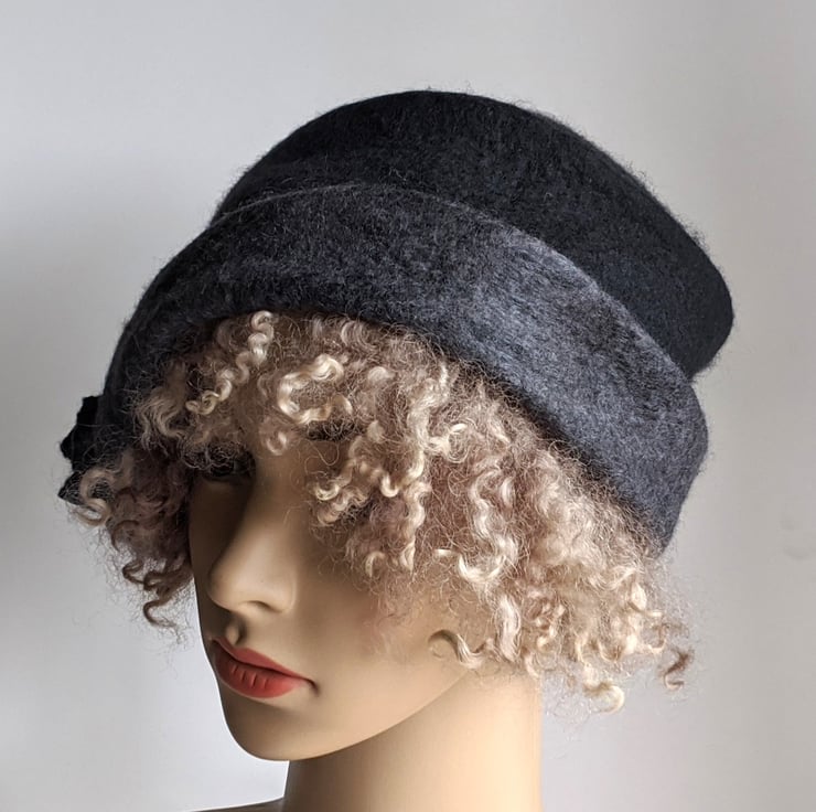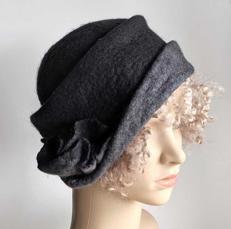 Handmade wet felted charcoal and grey merino wool cloche hat. A sweet feminine vintage style, with an asymmetrical brim and a matching flower.