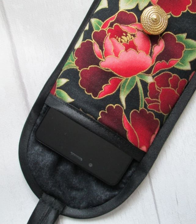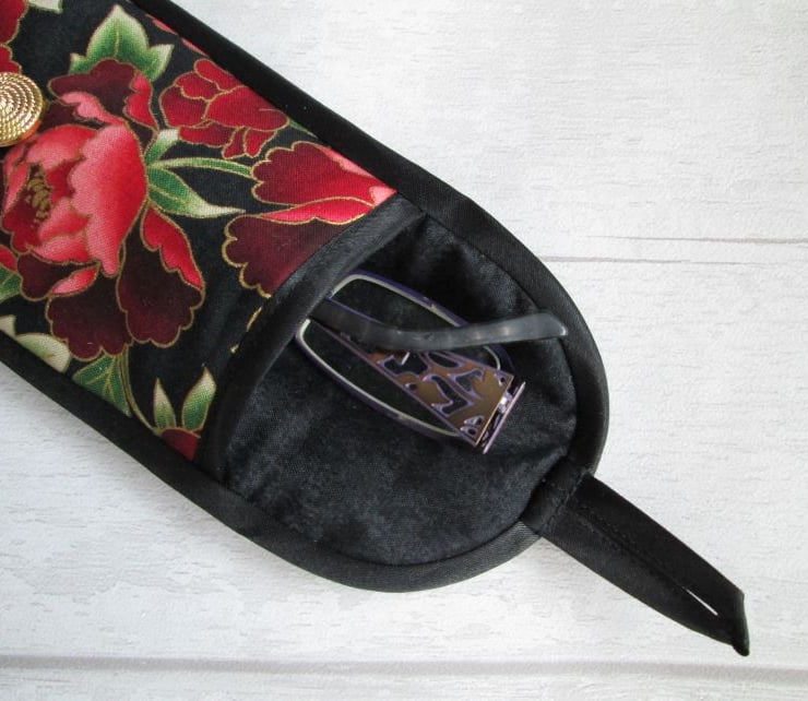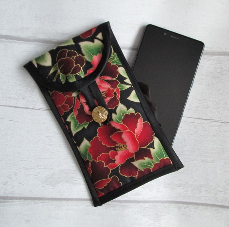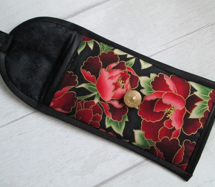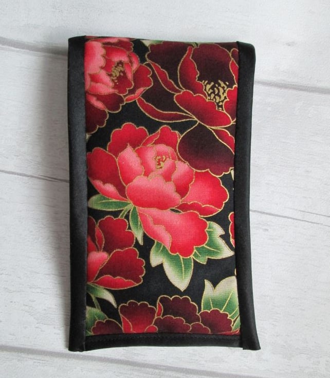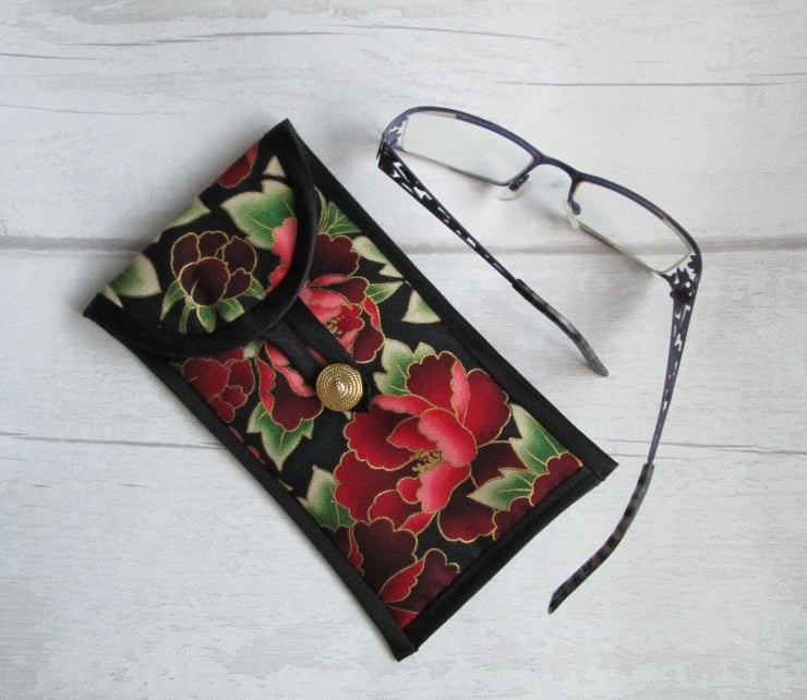 Going thorough my scrapbox during lockdown, I discovered that I had a couple of pieces of this gorgeous Oriental paeony fabric that, between them, were just big enough for a glasses/phone case. I've let the beautiful print speak for itself and teamed it with a simple marbled black cotton lining and black satin bias binding. Lightly padded to protect the contents it fastens with a loop and button.