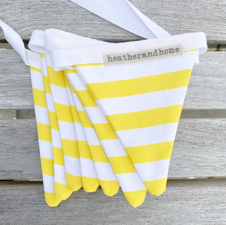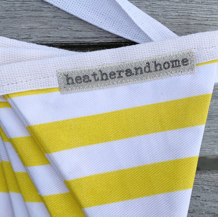 This jolly striped bunting is made of yellow and white cotton twill and comprises seven double-sided flags securely sewn onto white cotton tape and is finished with a 'heatherandhome' linen label.