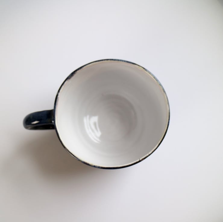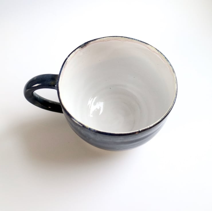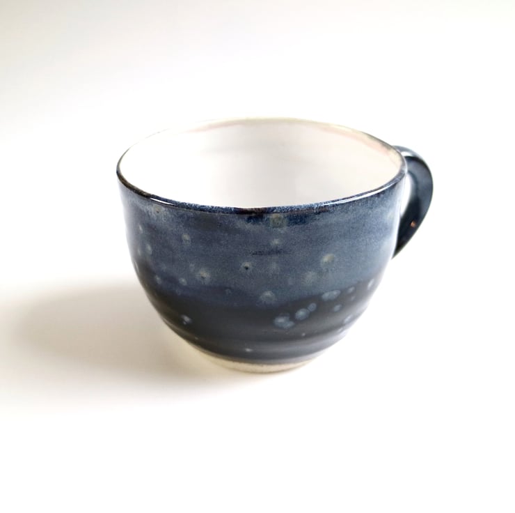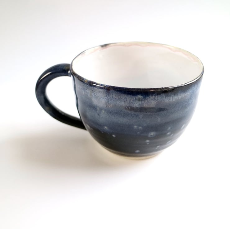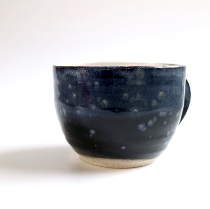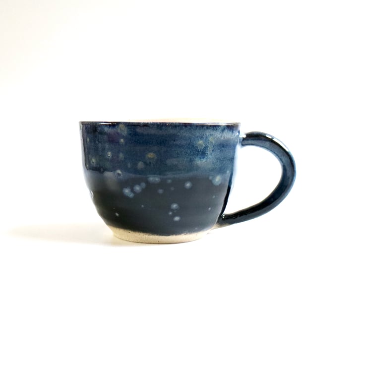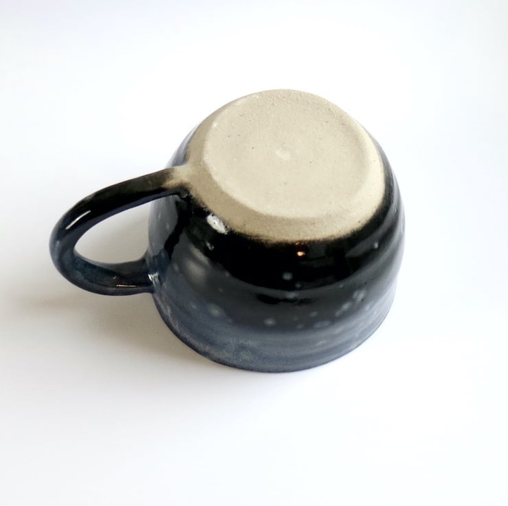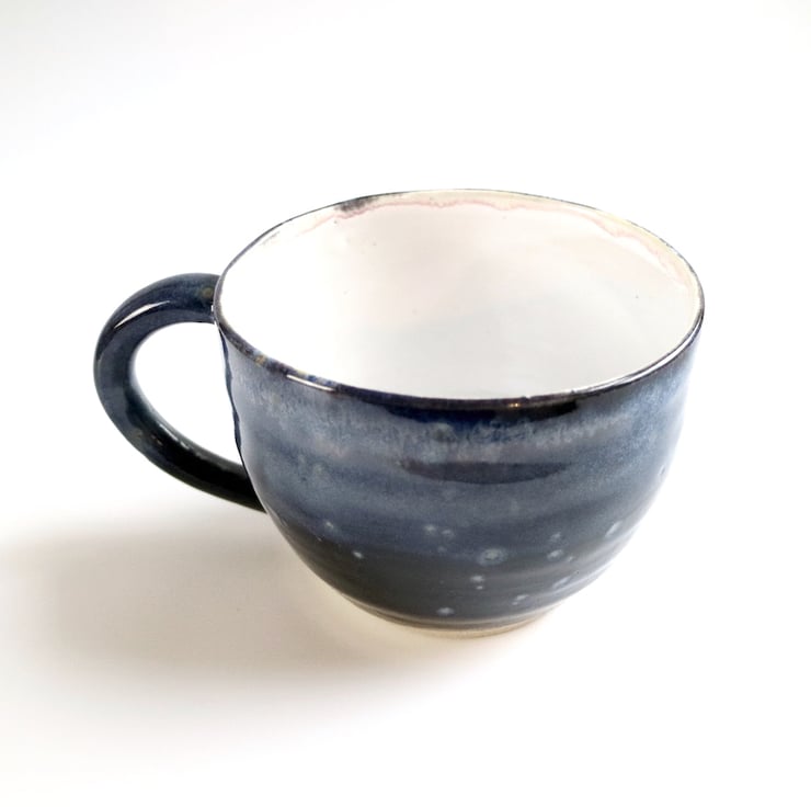 Inspired by the evening sky I have glazed the outside of the mug with a crystalline blue fading to black at the base.