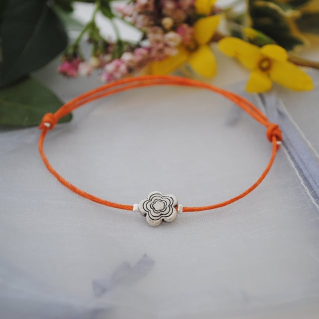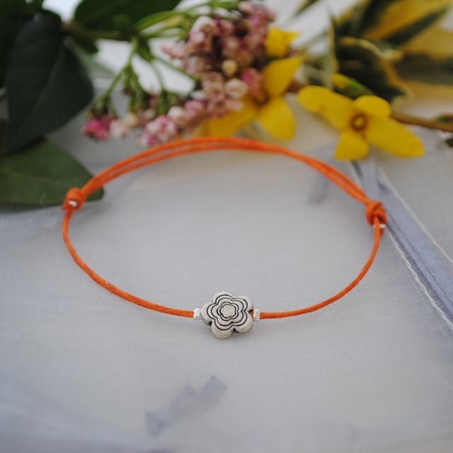 A simple cord friendship bracelet made with orange waxed cord with a silver flower.