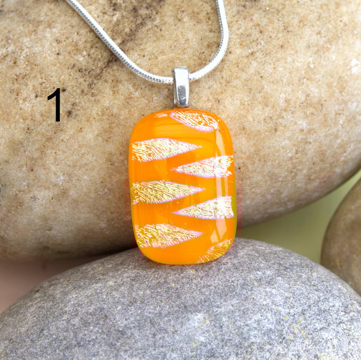 1. 1.5cm by 2cm - a bright orange pendant with dichroic zig zags