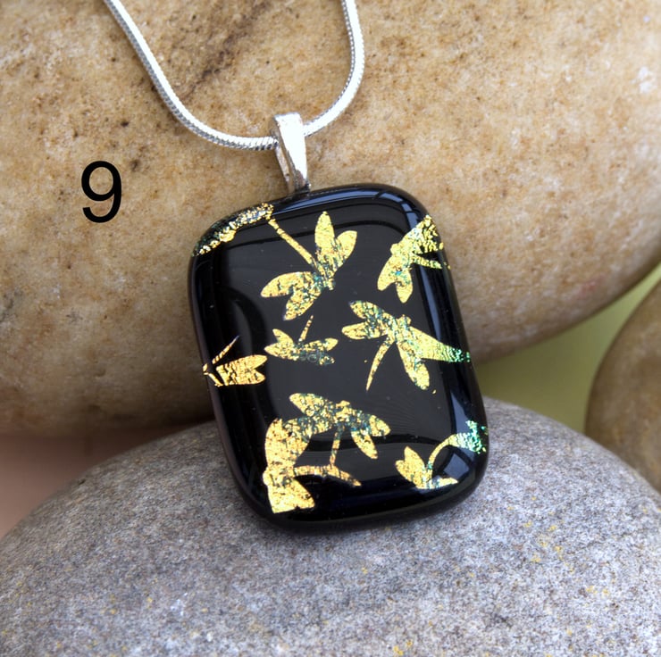 9. 2cm by 2.5cm - a stunning black pendant with little yellow dragonflies in sparkly dichroic