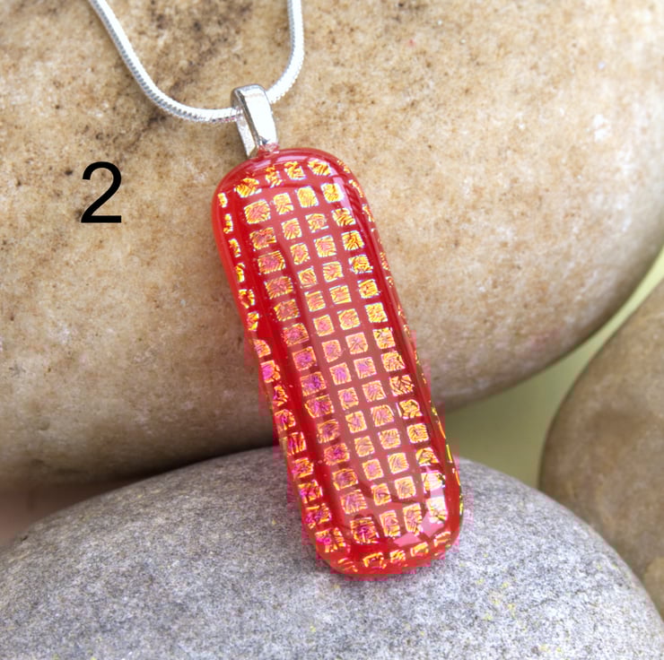 2. 1cm by 3.5cm - a bright red pendant with orange dichroic square pattern
