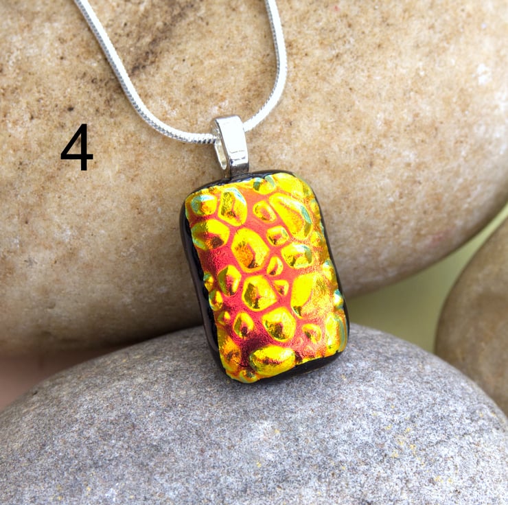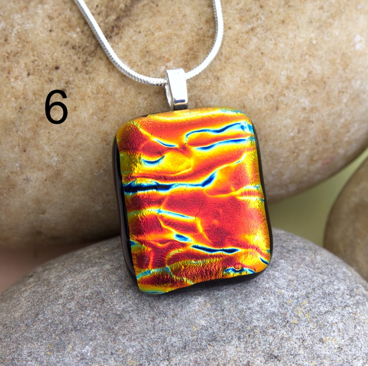 A selection of stunning red and orange dichroic glass pendants. Each one has been cut and assembled by hand and then fired in a kiln. Nine different pendants are available. Please make a note of the number in the photo and select which one you'd like from the drop down menu.