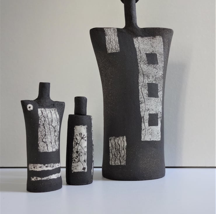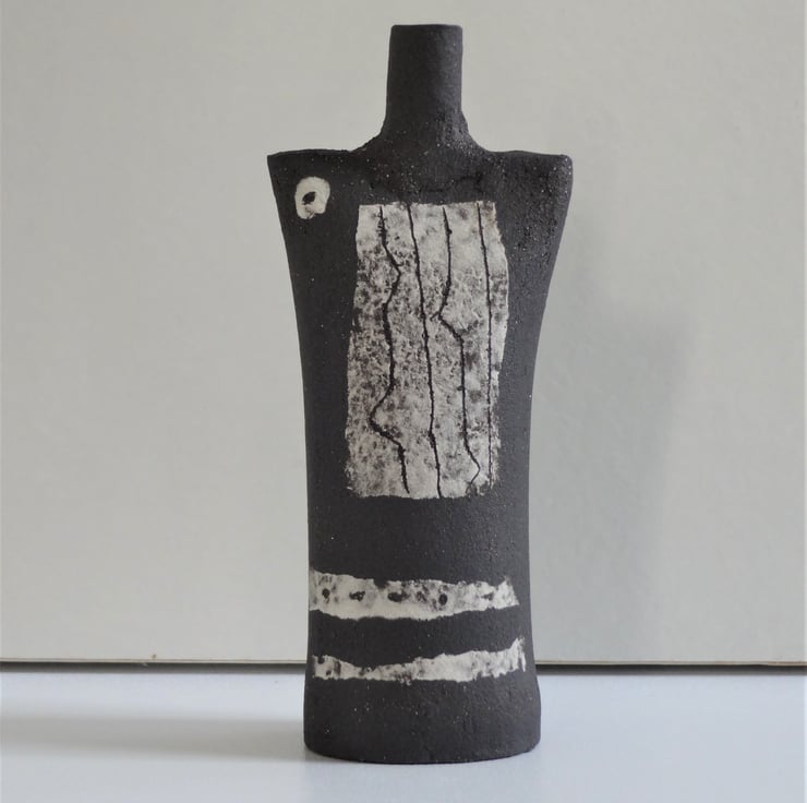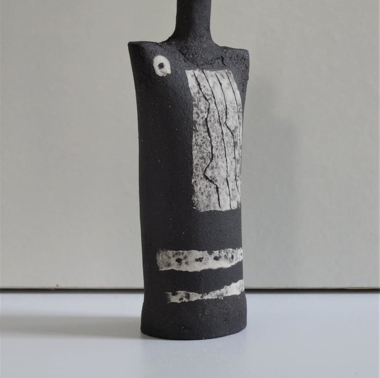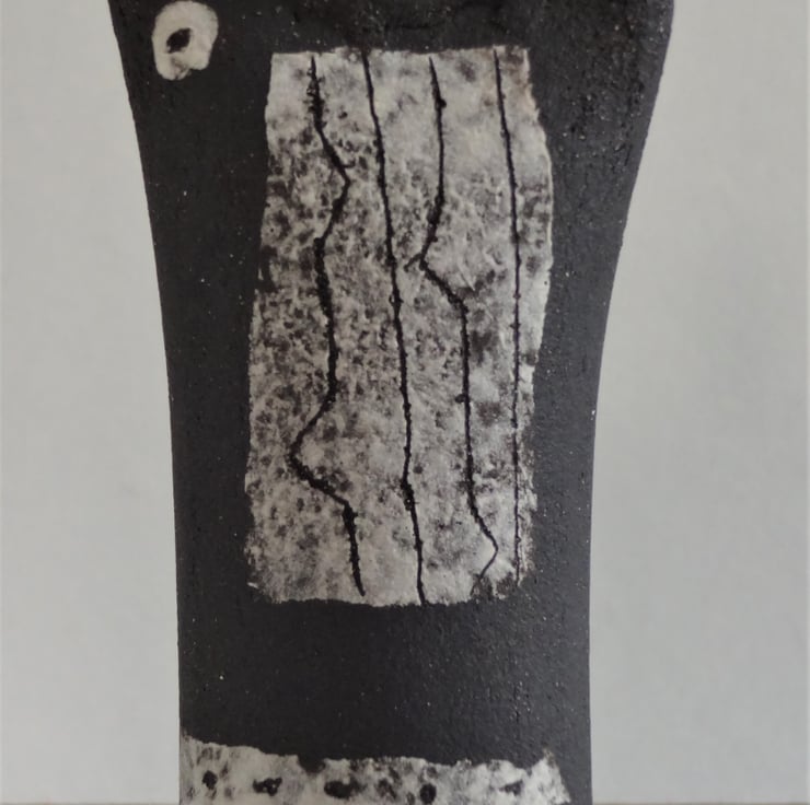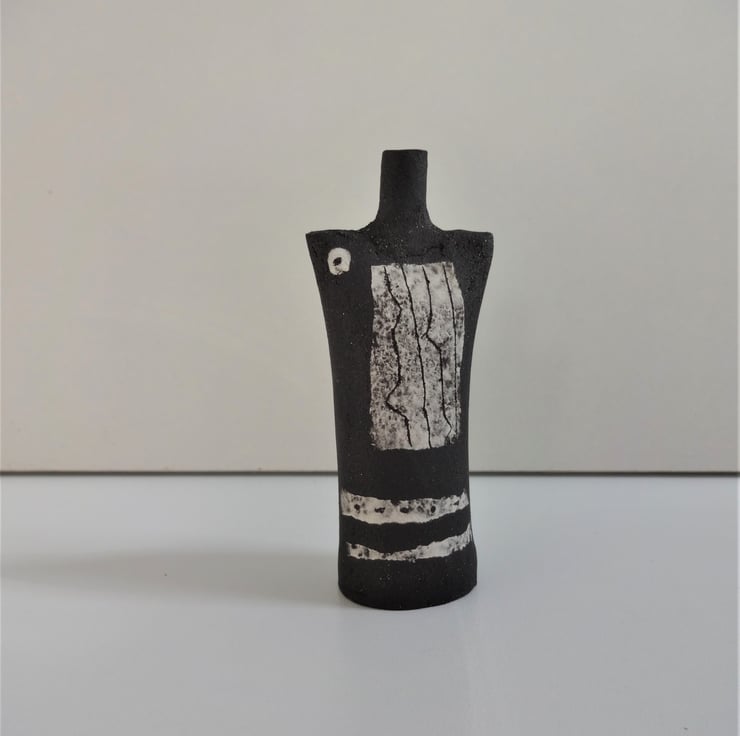 Gilda is just 9 cms high, and decorated in white, creating a tiny abstract monochrome figurative ceramic. I decorated the central panel with incised lines, a ceramic technique known as sgraffito. I added two irregular horizontal stripes and a circle to complete Gilda’s look. I use black stoneware clay and the design is fired into the clay at 1185 degrees Celsius. Gilda looks good on her own, and as part of a ‘family group’ with others from the Kindred Collection – one of the images shows Gilda with friends. On the base is my personal mark of a swallow in flight. The simple form and abstract decoration of Kindred figurative ceramics can make a contemplative focal point for yoga/mindfulness meditation – I’m a mindfulness practiser myself!