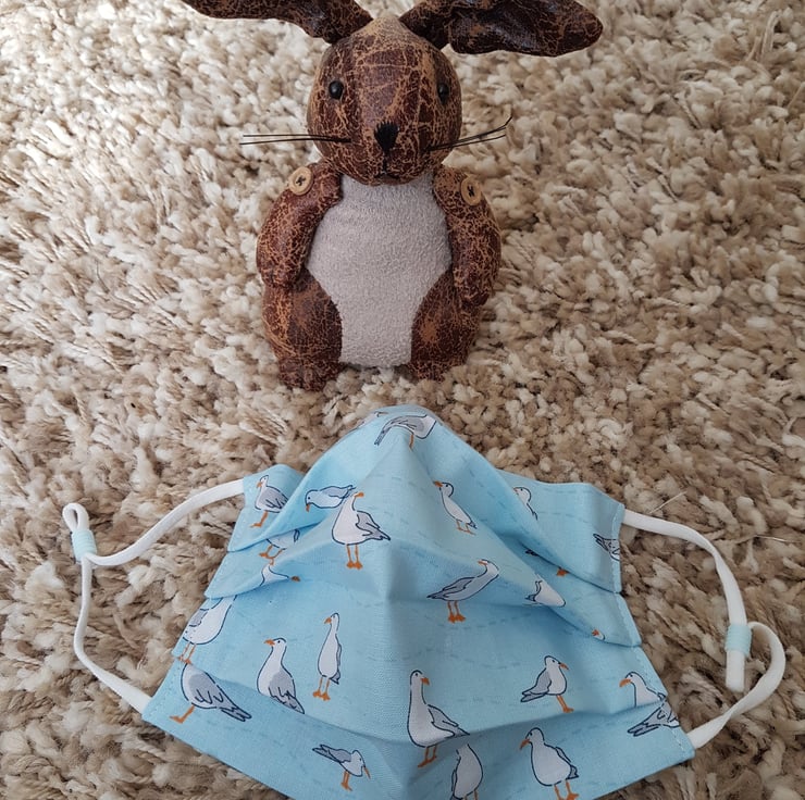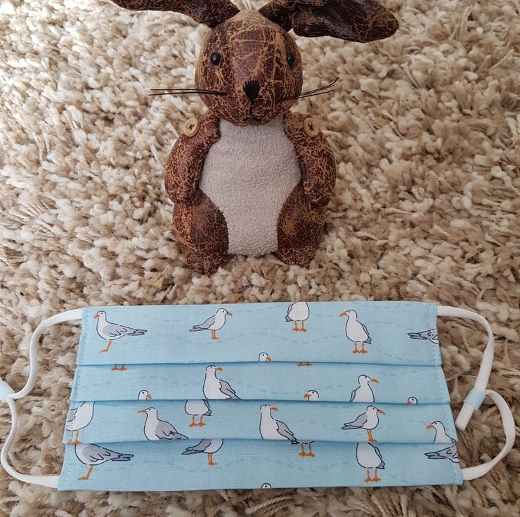 Adult face covering made from a seagull print on pale blue cotton. The face mask is made with 2 layers of cotton forming an inner pocket for a filter (not included) and is fastened over the ears with 2 loops of elastic and a toggle adjuster.