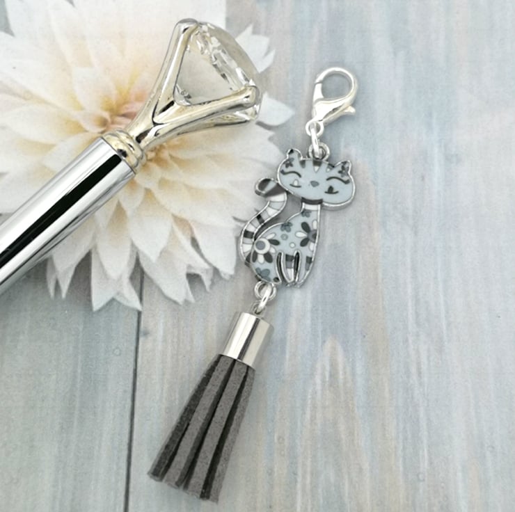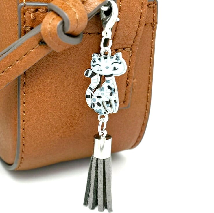 Pretty Enamel Cat Tassel Bag Charm. The faux suede tassel charm is an ideal accessory to your favourite bag. Perfect to brighten up any handbag or key set.